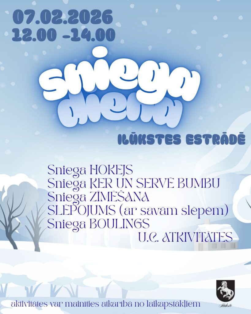 Sniega diena Ilūkstes estrādē Datums: 07.02.2026 Laiks: 12:00 - 14:00 Norises vieta: Ilūkstes estrāde 7. janvārī no plkst. 12.00 līdz 14.00 Ilūkstes estrādē notiks pasākums “Sniega diena”.