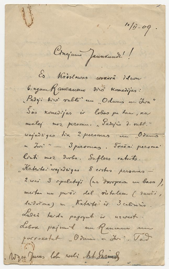 A.Skrindas luga ”Pādejī diwi rubļi” (1907). Skrindu dzimtas muzeja krājums.