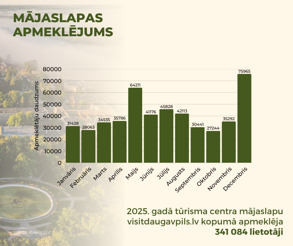 2025. gadā tūrisma centra mājaslapu visitdaugavpils.lv kopumā apmeklēja 341 084 lietotāji, kas ir par 50 877 lietotājiem jeb 18 % vairāk nekā 2024. gadā (290 207 lietotāji). Tas liecina par būtisku vietnes sasniedzamības un intereses pieaugumu. Izteikts lietotāju skaita pieaugums novērojams gada pirmajā pusē, savukārt vasaras un rudens mēnešos (jūnijs–oktobris) lietotāju skaits samazinājās. Īpaši izceļams ir decembris, kad lietotāju skaits sasniedza 65 099, kas ir par 193 % vairāk nekā 2024. gadā.