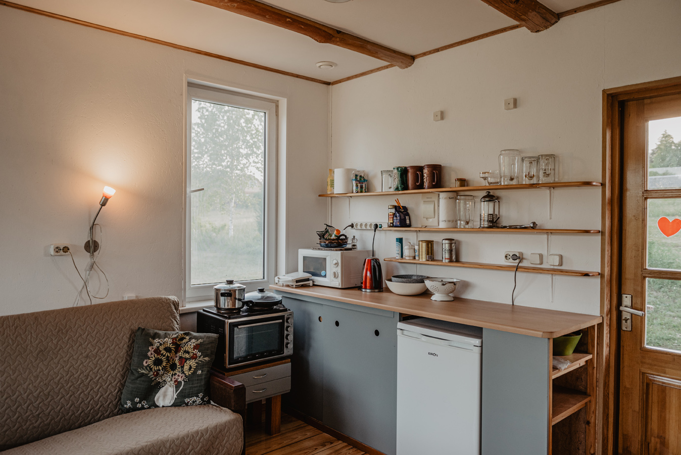 – virtuves aprīkojums (ledusskapis, elektriskā plīts, mikroviļņu krāsns, tosters, elektriskā tējkanna, trauki)