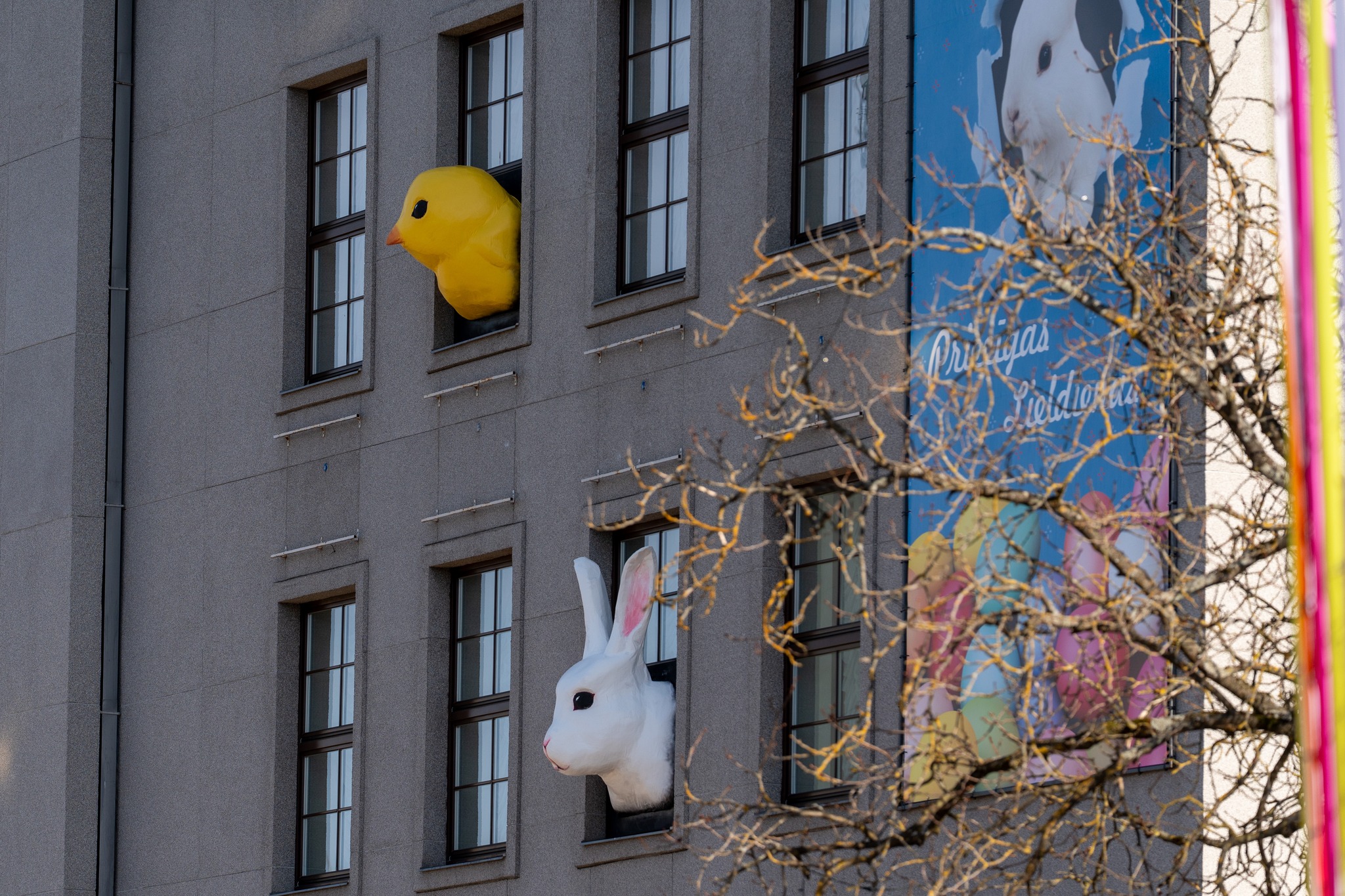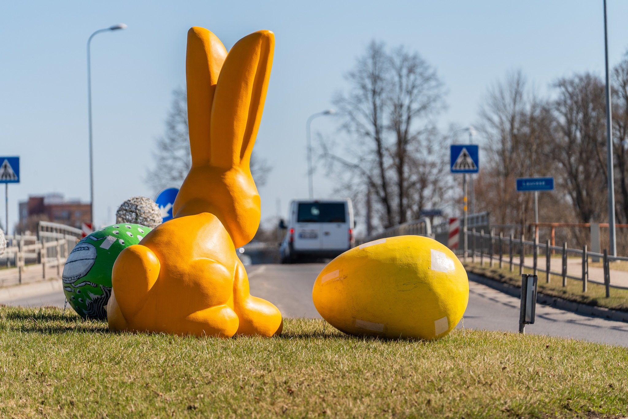 Svētku noskaņa jūtama arī citviet pilsētā. Lielajos krāsainajos puķu podos “salēkuši” koši zaķi, bet satiksmes rotācijas apļos izvietoti tematiski akcenti, kas ļauj izjust svētku atmosfēru jau pilsētas kustības ritmā.