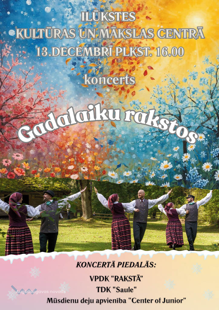 13. decembrī 16.00 Ilūkstes Kultūras un mākslas centrā Rīgas vidējās paaudzes deju kolektīva “Rakstā” koncerts “Gadalaiku rakstos”