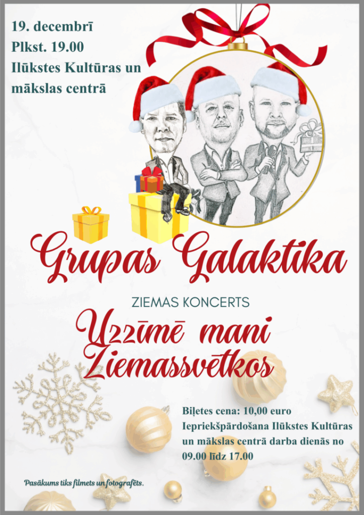 19. decembrī 19.00 Grupas “Galaktika” Ziemas koncerts “Uzzīmē mani Ziemassvētkos”. Biļetes cena 10,00 euro. Iepriekš pārdošanā no 8. decembra Ilūkstes Kultūras un mākslas centrā darba dienās no 9.00-17.00.