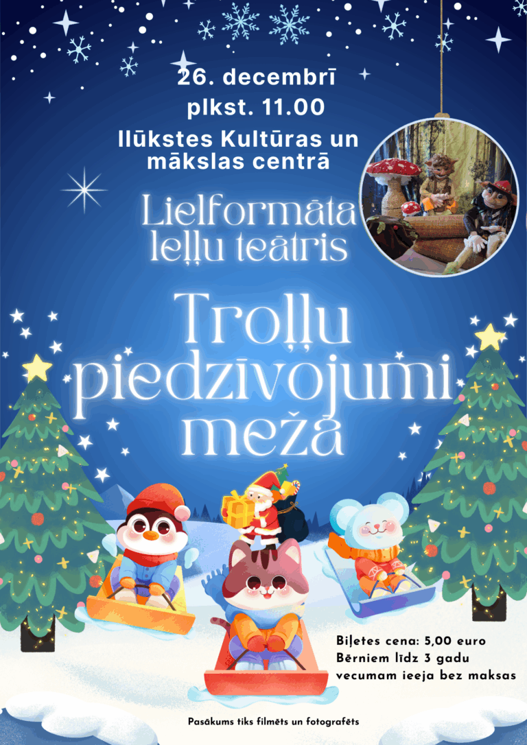26. decembrī 11.00 Ilūkstes Kultūras un mākslas centrā Ziemassvētku pasākums bērniem “Troļļu piedzīvojumi mežā”. Ieejas maksa 5,00 euro, bērniem līdz 3 gadu vecumam ieeja bez maksas