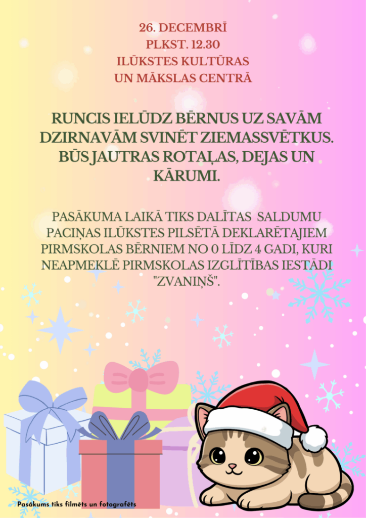 26. decembrī 12.30 Ilūkstes Kultūras un mākslas centrā Ziemassvētku saldumu paciņu saņemšana Ilūkstes pilsētā deklarētajiem pirmskolas vecuma bērniem no 0 līdz 4 gadi, kuri neapmeklē pirmsskolas izglītības iestādi “Zvaniņš”