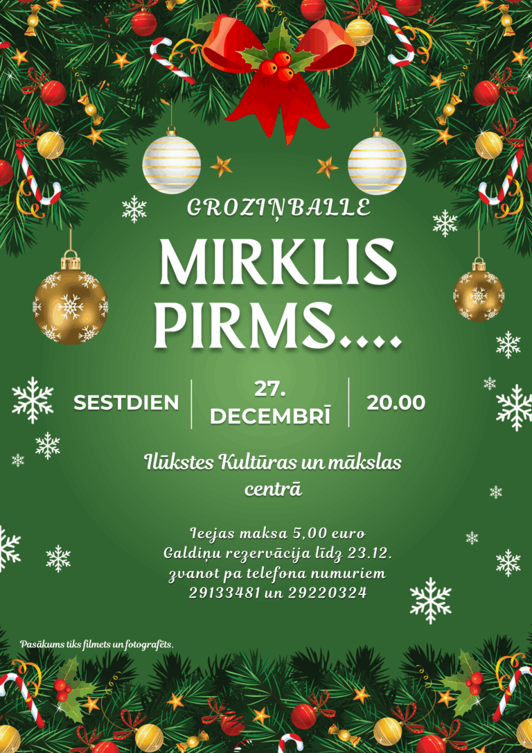 27. decembrī 20.00 groziņballe “Mirklis pirms…” ar grupu “Ginc un Es”. Ieejas maksa 5,00 euro, galdiņu rezervācija līdz 23. decembrim pa tālr. 29133481, 29220324