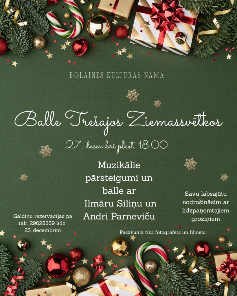 27. decembrī 18.00 Eglaines Kultūras namā “Balle trešajos Ziemassvētkos”, galdiņu rezervācija pa tālr. 29628369 līdz 23. decembrim