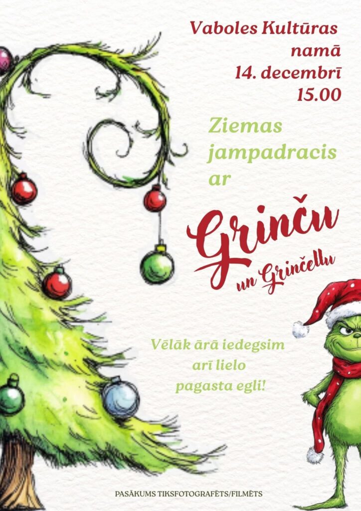 14. decembrī 15.00 Vaboles Kultūras namā ziemas jampadracis ģimenēm ar Grinču un Grinčellu, lielās pagasta egles iedegšana