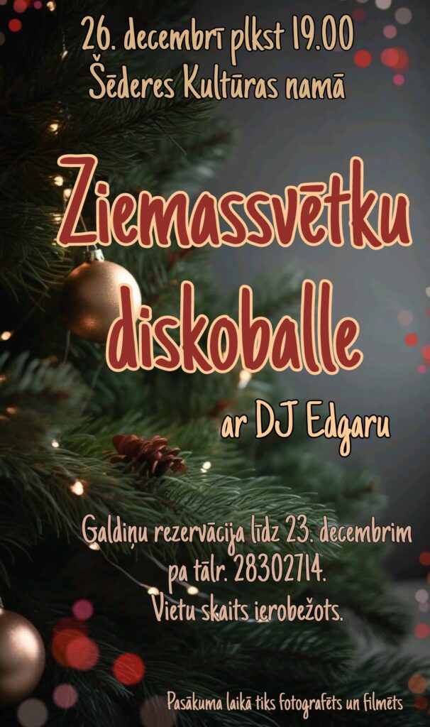 26. decembrī 19.00 Šēderes Kultūras namā Ziemassvētku diskoballe kopā ar DJ Edgaru. Galdiņu rezervācija līdz 23. decembrim.