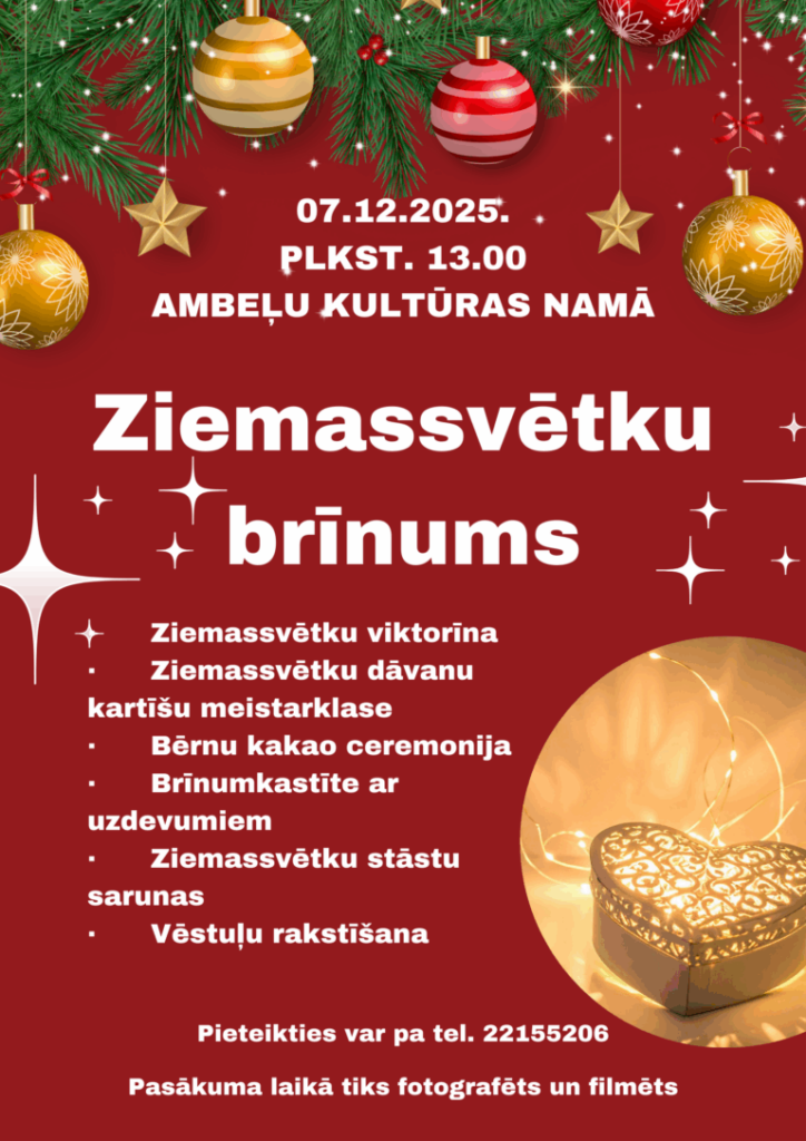 7. decembrī 13.00 Ambeļu Kultūras namā bērnu pasākums “Ziemassvētku brīnums”, Ziemassvētku viktorīna, Ziemassvētku dāvanu kartīšu meistarklase, bērnu kakao ceremonija, brīnumkastīte ar uzdevumiem, Ziemassvētku stāstu sarunas, vēstuļu rakstīšana.