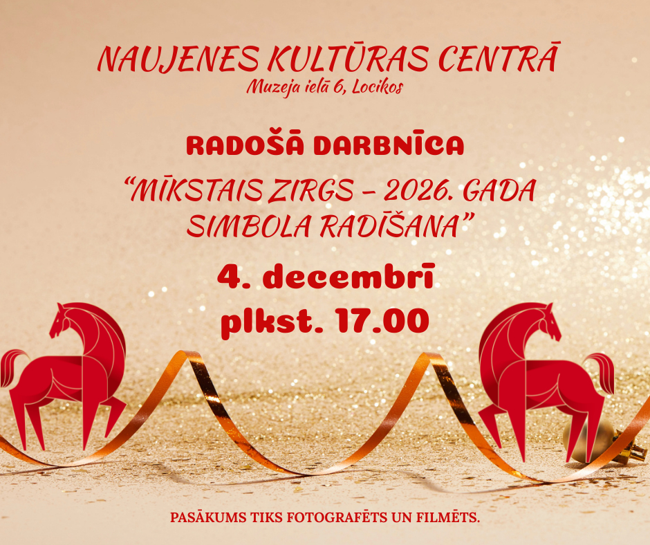 4. decembrī 17.00 Naujenes Kultūras centrā radošā darbnīca “Mīkstais zirgs – 2026. gada simbola radīšana”, pieteikšanās pa tālr.26293212
