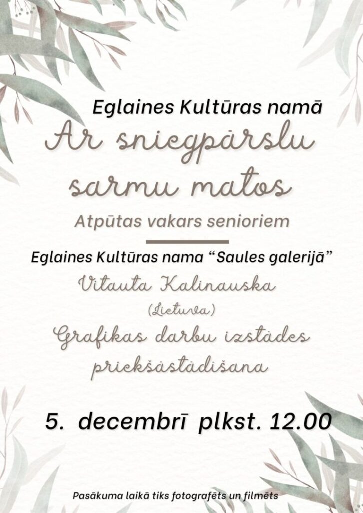 5. decembrī 12.00 Eglaines Kultūras namā atpūtas vakars senioriem “Ar sniegpārslu sarmu matos”, Vitauta Kalinauska (Lietuva) grafikas darbu izstādes atklāšana