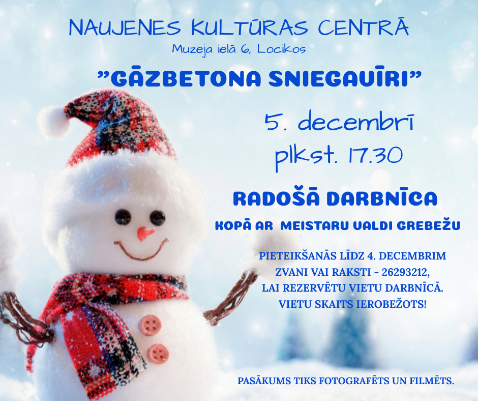 5. decembrī 17.30 Naujenes Kultūras centrā Radošā darbnīca ar meistaru Valdi Grebežu “Gāzbetona Sniegavīri”, pieteikšanās pa tālr.26293212