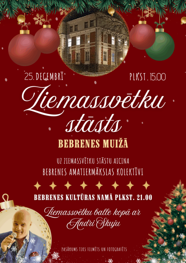 25. decembrī 15.00 Bebrenes muižā koncerts “Ziemassvētku stāsts” ,  21.00 Bebrenes Kultūras namā Ziemassvētku balle ar Andri Skuju.