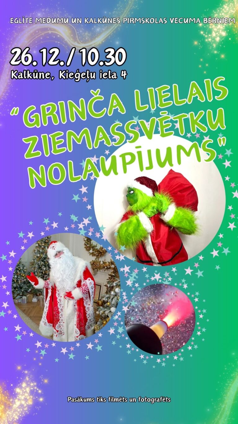 26. decembrī 10.30 Ķieģeļu ielā 4 eglīte Medumu un Kalkūnes pirmsskolas vecuma bērniem “Grinča lielais Ziemassvētku nolaupījums” kopā ar BOOM Time.