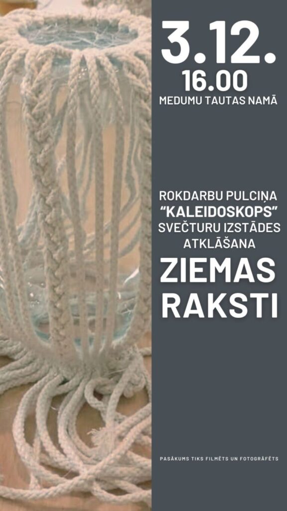 3. decembrī 16.00 Medumu Tautas nama foajē Medumu rokdarbu pulciņa “Kaleidoskops” svečturu izstādes “Ziemas raksti” atklāšana