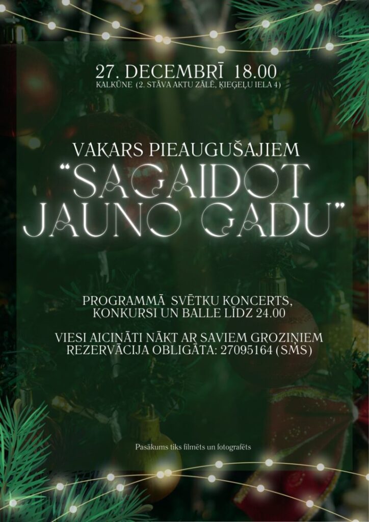 27. decembrī 18.00 Kalkūne (2. stāva aktu zālē, Ķieģeļu iela 4) Pasākums “Sagaidot Jauno gadu”. Konkursi un balle līdz 24.00. Viesi aicināti nākt ar saviem groziņiem. Rezervācija pa tālr. 27095164 (sms)
