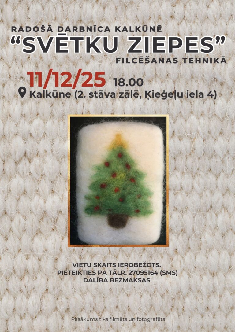 11. decembrī 18.00 Kalkūne (2. stāva aktu zālē, Ķieģeļu iela 4) radošā darbnīca “Svētku ziepes” filcēšanas tehnikā. Darbnīca pieaugušajiem. Pieteikties pa tālr. 27095164 (sms)