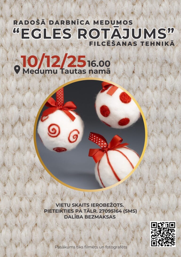 10. decembrī 16.00 Medumu Tautas namā radošā darbnīca “Egles rotājums” filcēšanas tehnikā. Darbnīca paredzēta pieaugušajiem. Pieteikties pa tālr. 27095164 (sms)