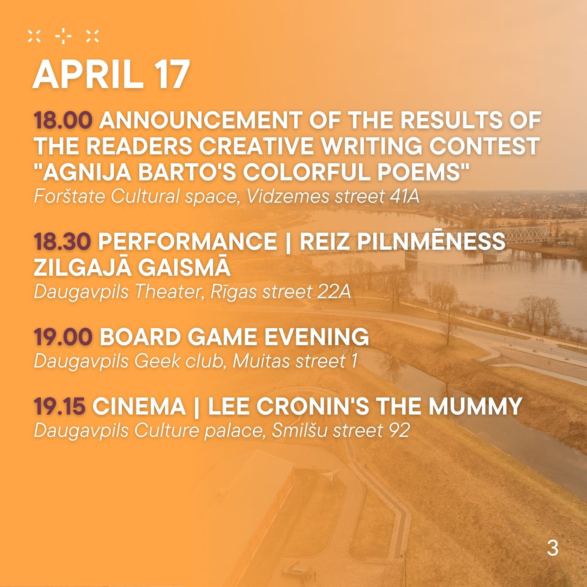 - 18.00 | Announcement of the results of the readers’ creative writing contest “Agnija Barto’s Colorful Poems” | Forštate Cultural Space, Vidzemes Street 41A