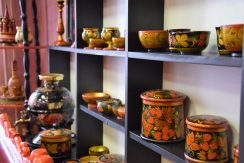 Hohloma products are popular all over the world. They attract, first of all, with their original coloring. The traditional pattern of climber plants and flowers, festive elegant color of painting, that is based on a combination of red, black and gold, giving the real jewel to Hohloma. Hohloma products, glittering with gold and splendor of varnishes, pleasant with colorful, poetic painting, became the subject of collecting long time ago. The collection of Daugavpils Russian Cultural center, which has been collected for ten years, is considered to be one of the best in Latvia. It includes a variety of items – decorative vases, plates and ladles, spoons, salt shakers, sets of dishes for fish soup, honey, berries and kvass, and also multi-disciplinary sets intended for the holiday table. Hohloma chamber is not only an exhibition hall, but also an original cafe. Here, the employees of Russian Cultural center receive numerous guests, who are necessarily entertained with pancakes and fragrant tea. Children’s events, lectures on folk art for pupils, friend ‘gatherings’ and other interesting events take place there. In addition, chamber is a wonderful place for original presentations, small banquets and corporate parties.