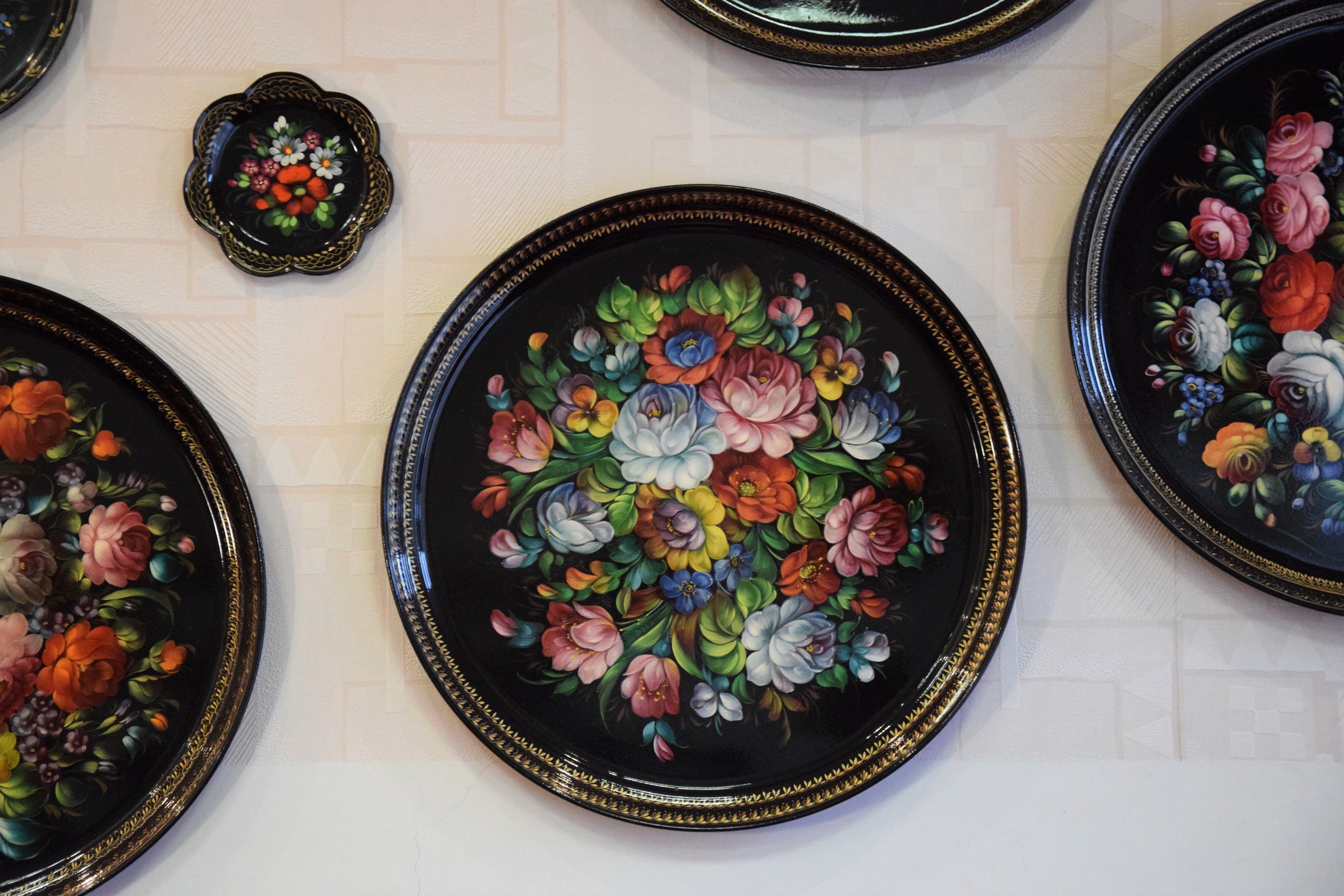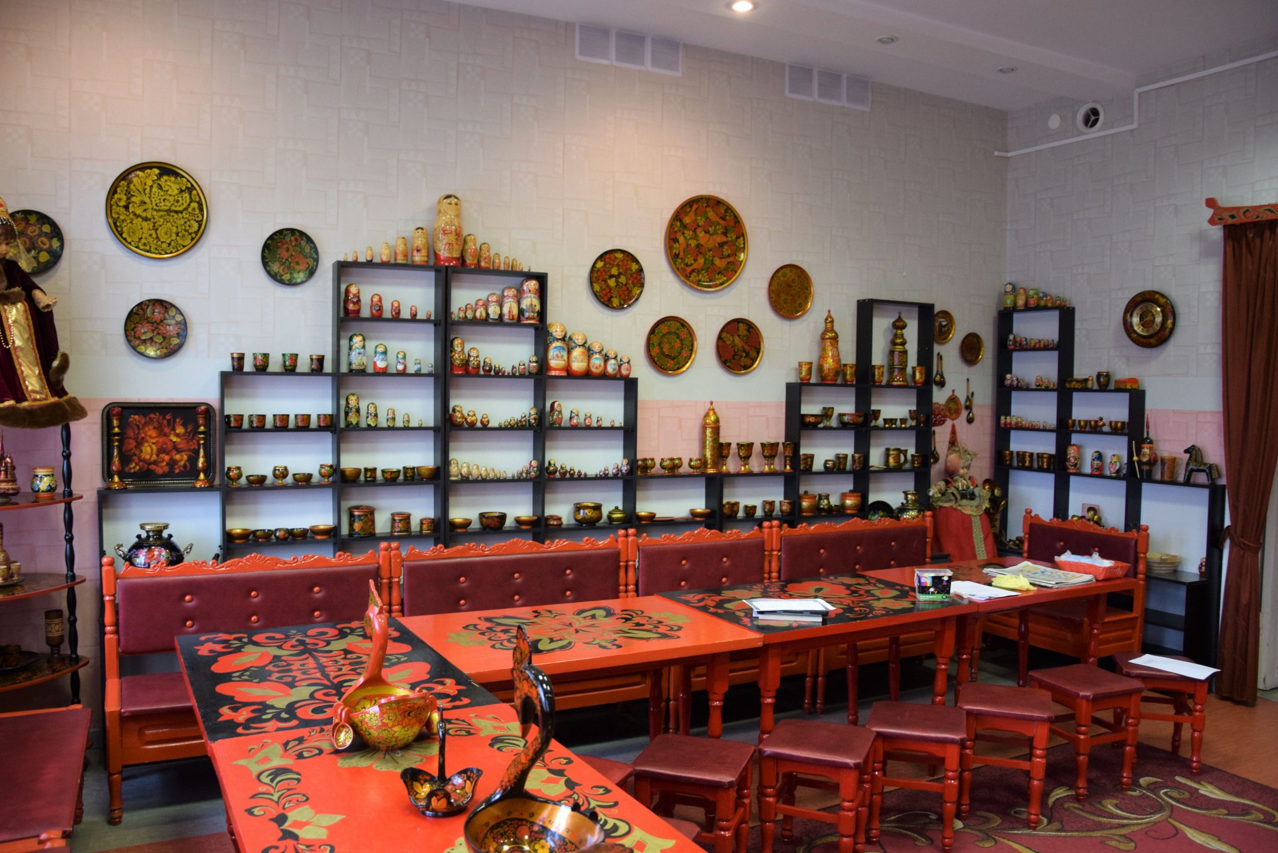 Hohloma chamber was opened in February 2005. This is one of the most interesting and originally decorated exhibition halls of Russian House. A small, but very cozy room styled under Russian izba, but all the furniture is painted with Hohloma patterns. The colorful scarves, imported from different regions of Russia, bright Russian dolls and copper samovars add up to the unique colour to the interior. But the chief ornament of the chamber is the collection of original Russian Hohloma. Hohloma is a bright, original phenomenon of Russian folk decorative art. This traditional art craft can boast of its more than three hundred year history. It emerged in the second half of the 17th century in Zavolzje of Nizny Novgorod near the shopping village Hohloma, from which it took its name. The forest edge of Zavolzje had long been famous for its wonderful wood-carvers, but local masters of painting, among which were famous icon painters, invented a unique way of painting of wood products, that imitated gilding.