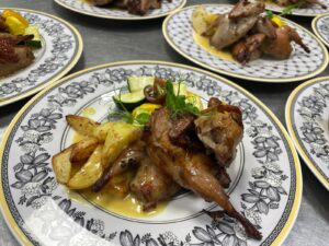 Trīs kārtu maltīte. Uzkodas: marinēta krāsnī cepta paipala, gaileņu žuljēns ar pašceptu maizi, muižas soļanka. Pamatēdiens: cūkgaļas ribiņas BBQ-burbona glazūrā, BIO liellopa gaļas podiņš ar dārzeņiem. Saldais: Dvietes īstais lauku saldējums vai “kas izcepts”.