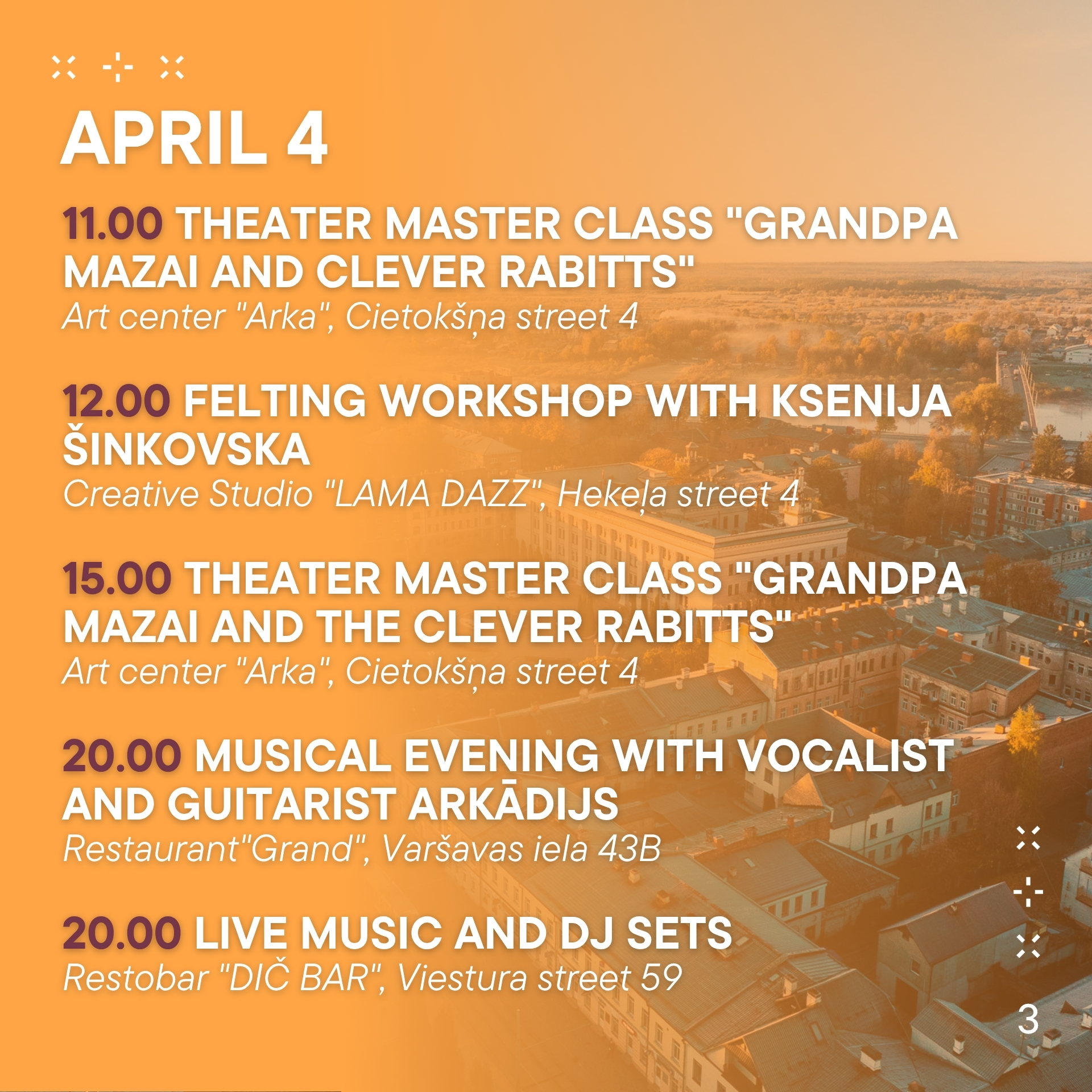 - 15.00 | THEATER WORKSHOP „GRANDPA MAZAI AND THE LITTLE SMART RABBITS” | Art Center “Arka”, Cietokšņa Street 4