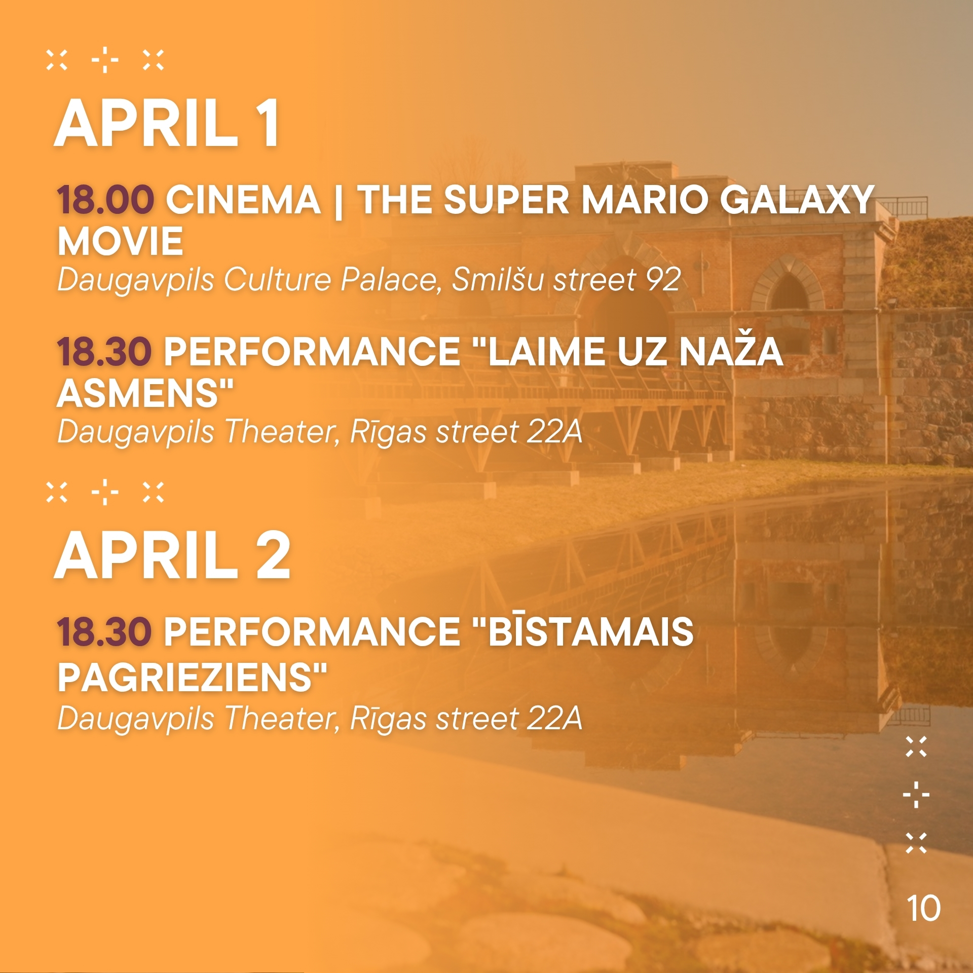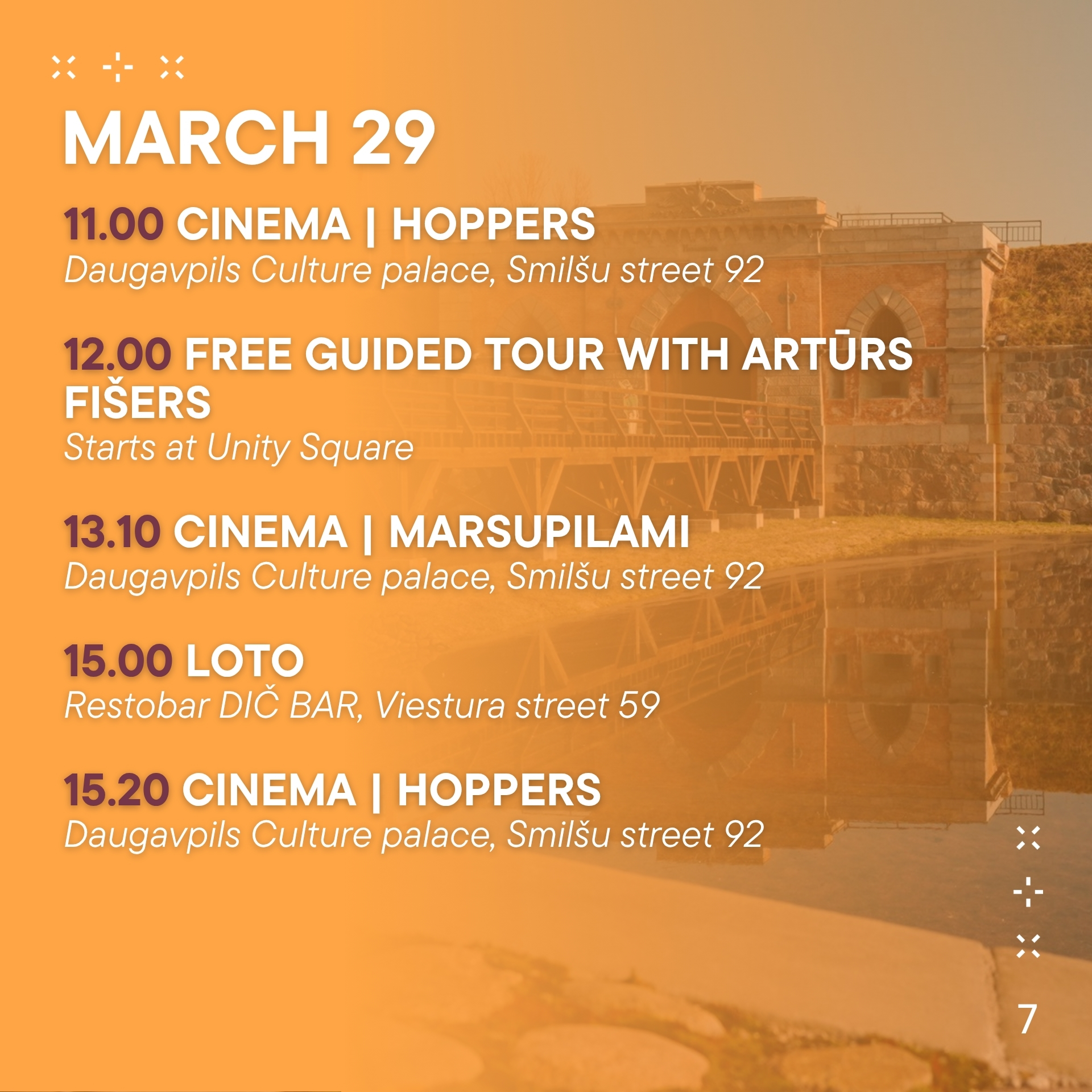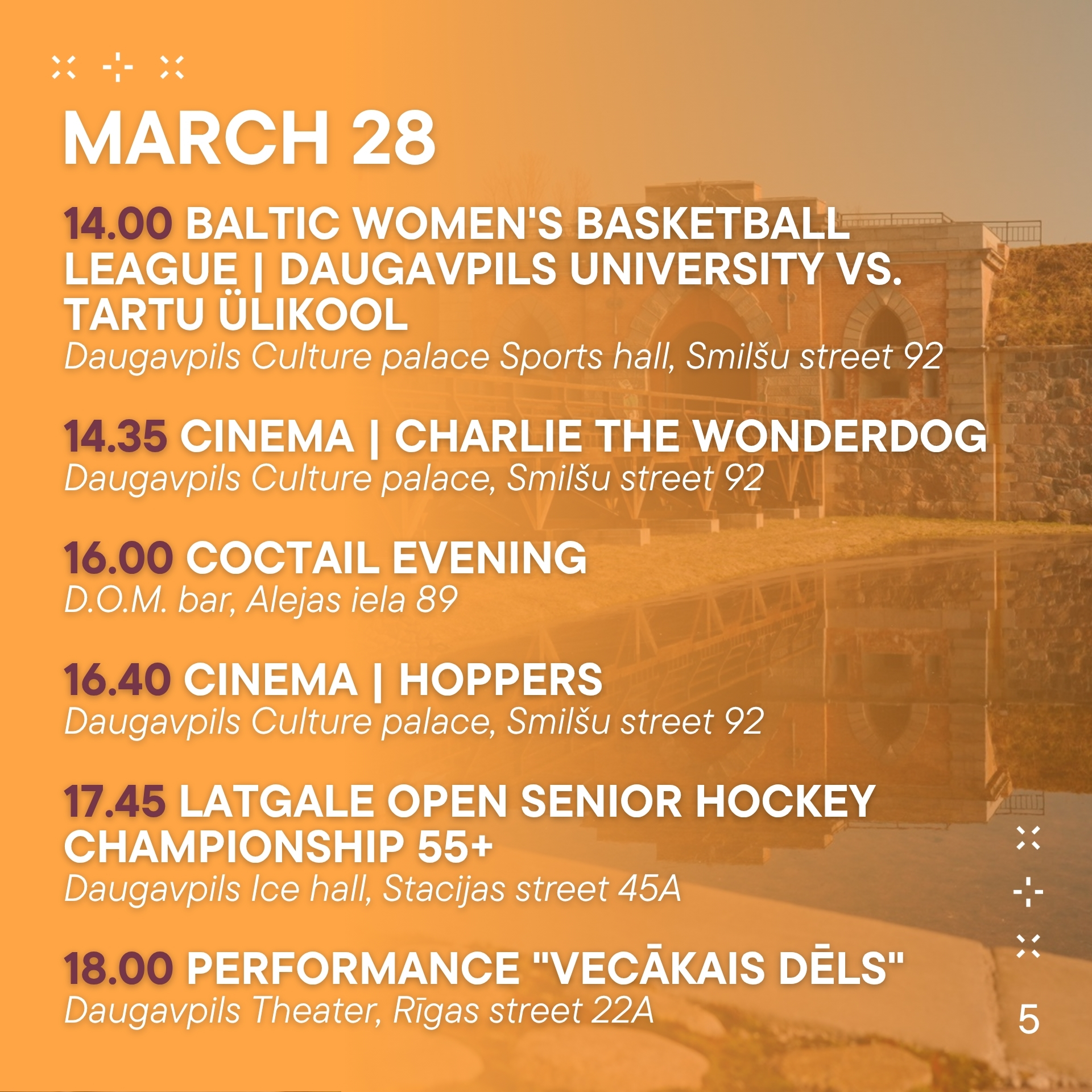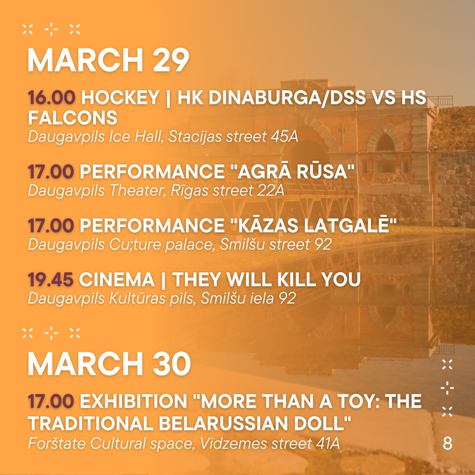 • 19.00 | CINEMA | Project Hail Mary | Daugavpils Culture Palace, Smilšu Street 92 19:30 | Eastern Latvia Open Hockey Championship | “DVL” vs. HK “Sēļi” | Daugavpils Ice Hall, Stacijas Street 45A