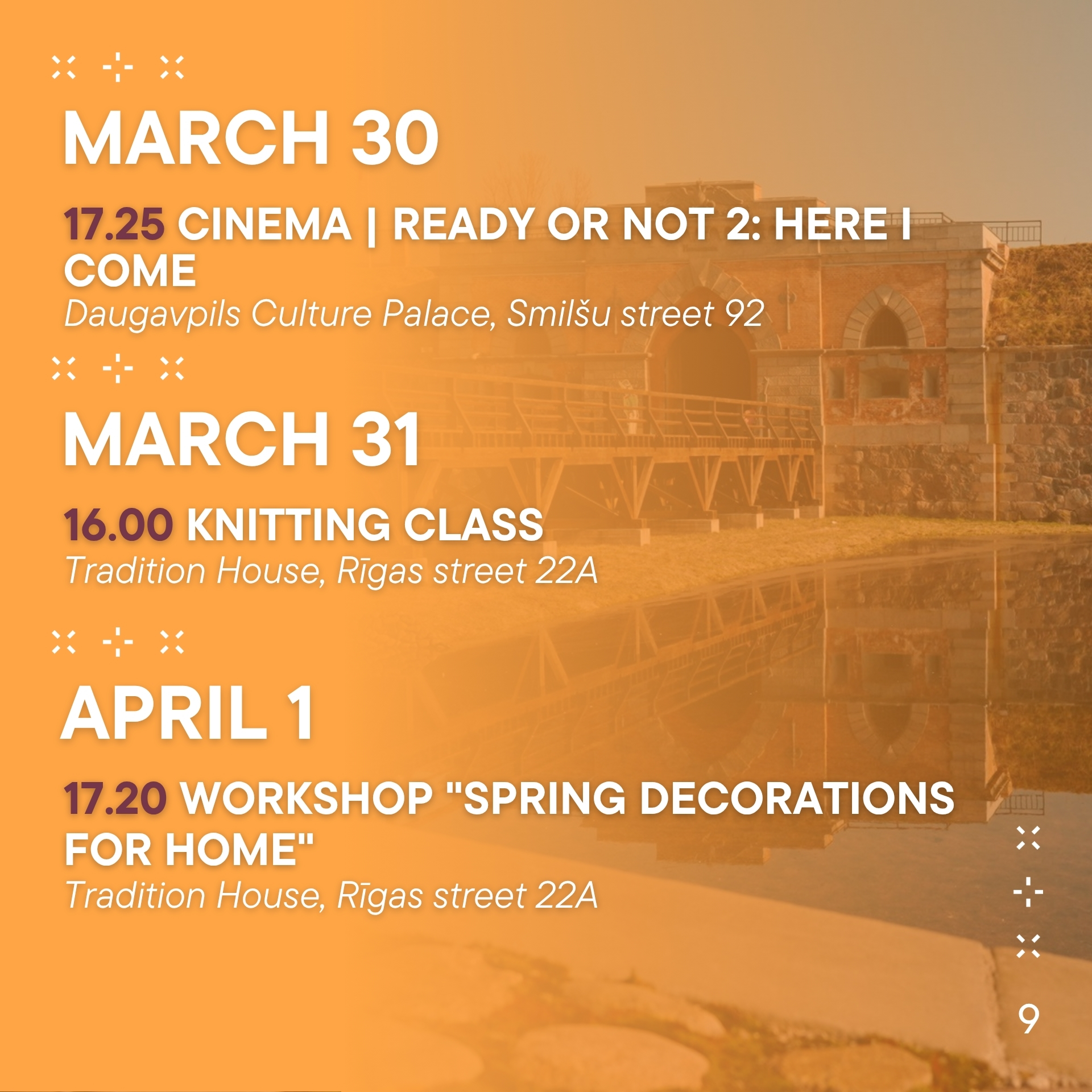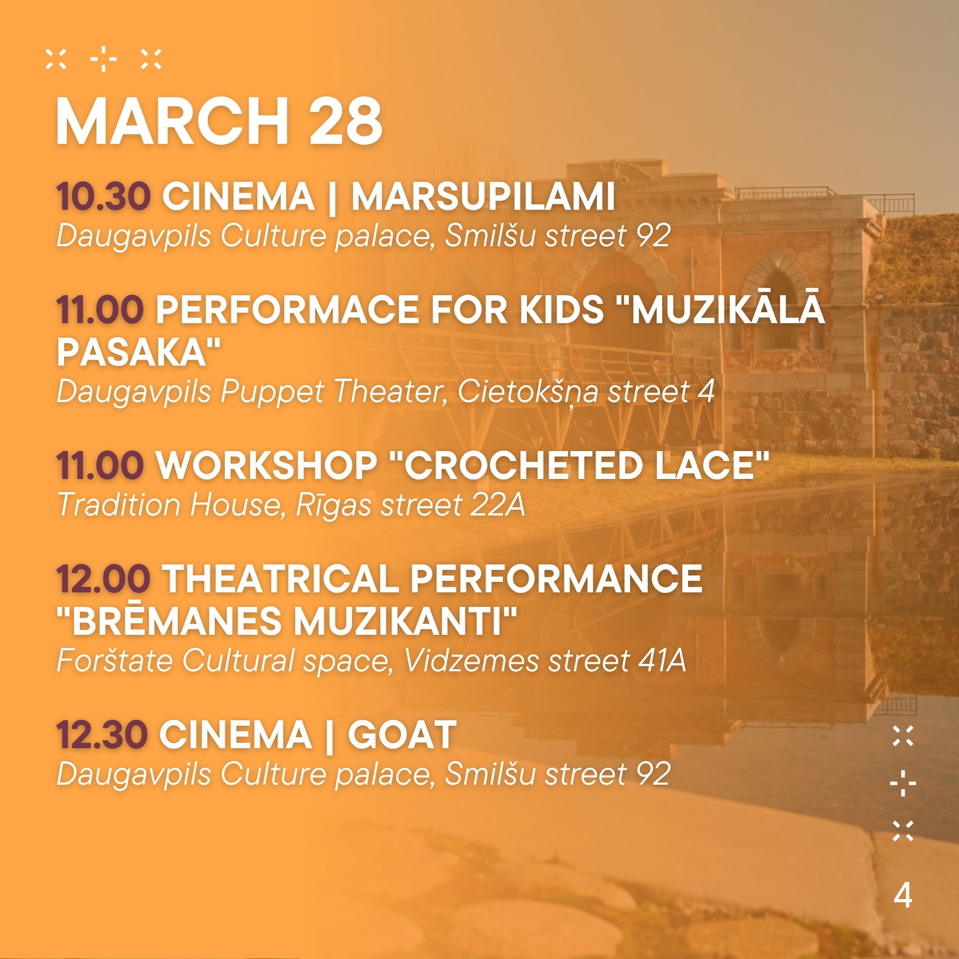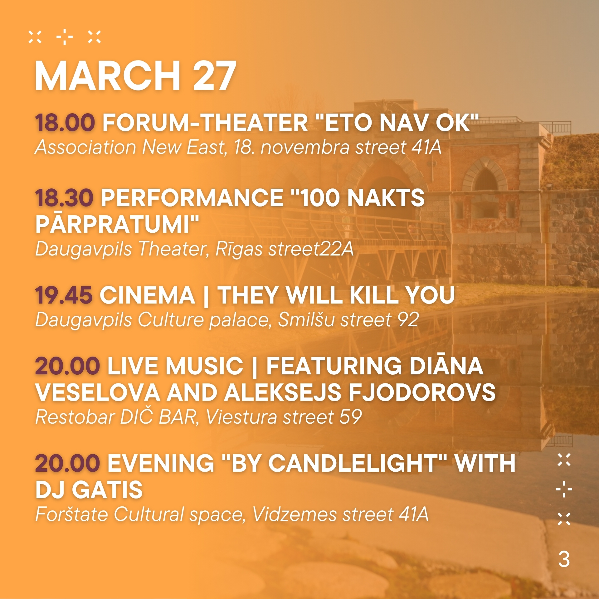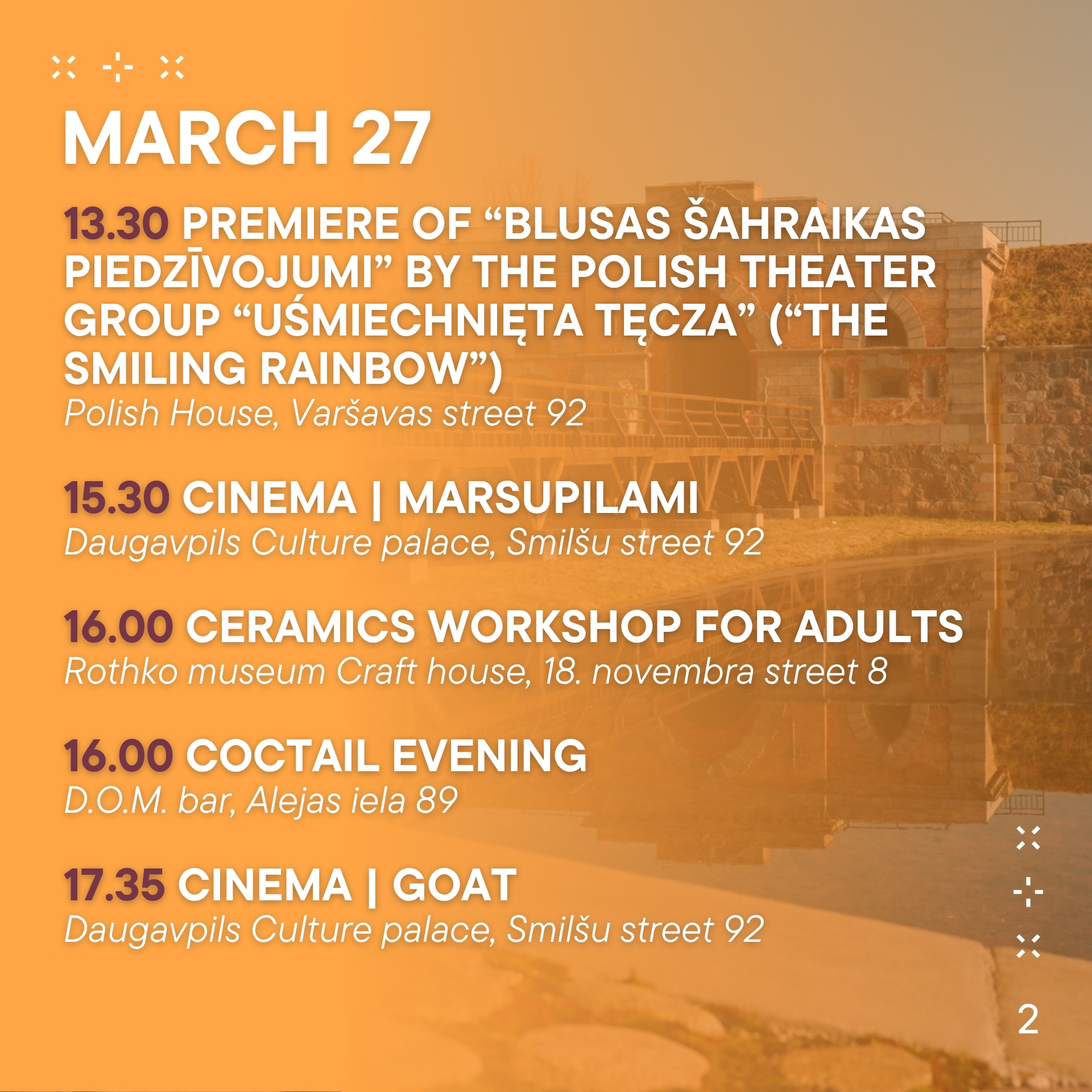 • 19.00 | CINEMA | Project Hail Mary | Daugavpils Culture Palace, Smilšu Street 92 19:30 | Eastern Latvia Open Hockey Championship | “DVL” vs. HK “Sēļi” | Daugavpils Ice Hall, Stacijas Street 45A