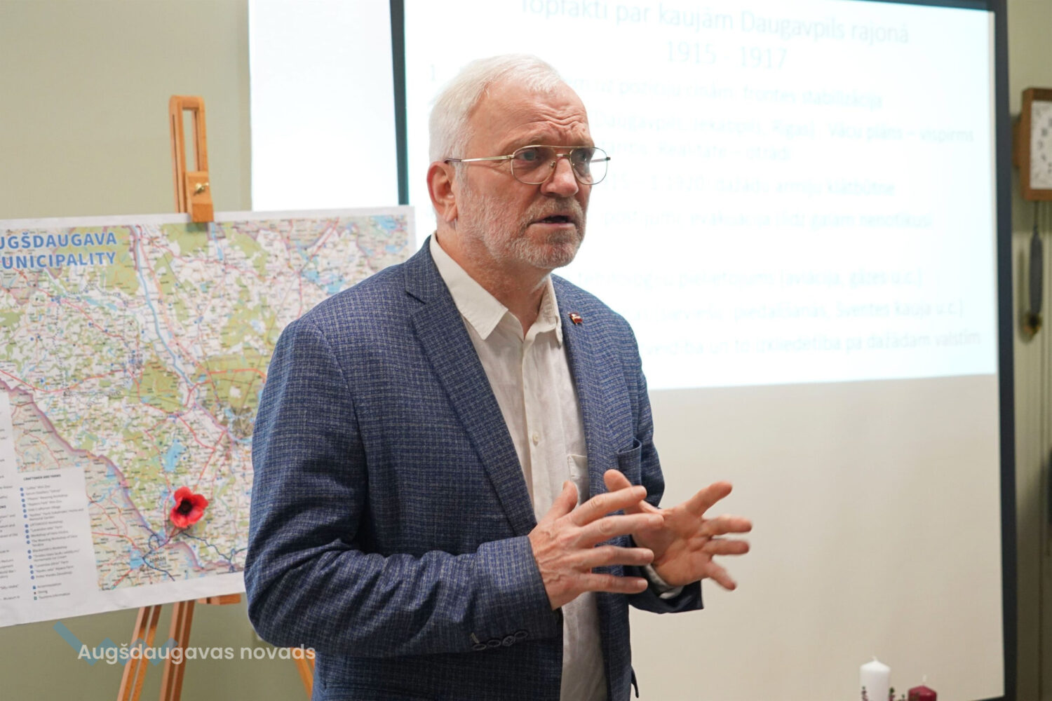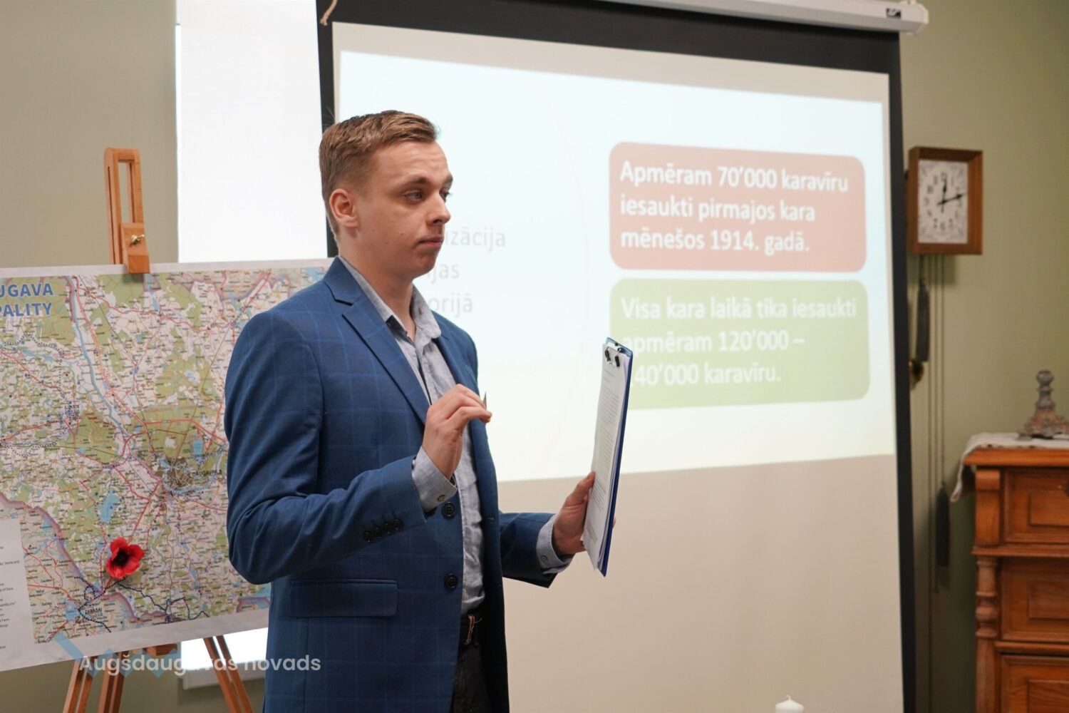 Referenti pievērsīsās Pirmā pasaules kara notikumiem mūsdienu Augšdaugavas novada teritorijā — mobilizācijai, frontes līniju attīstībai, karadarbības gaitai pie Ilūkstes, Dvietes, Daugavpils un Demenes, kā arī vācu armijas klātbūtnei un tās atstātajām pēdām muižās un kapsētās. Daugavpils Novadpētniecības un mākslas muzeja speciālists Kristaps Jumis pastāstīja par mobilizācijas gaitu Daugavpilī 1914. gadā, balstoties uz Dvinskas kara apriņķa priekšnieka rīkojumiem.