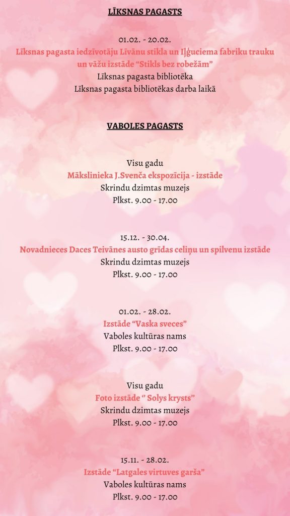 Pasākumi Augšdaugavas novadā no 13. līdz 19. februārim 12.02.2023 Visi ir laipni aicināti ielūkoties nedēļas kultūras pasākumos un izstāžu piedāvājumā Augšdaugavas novadā!