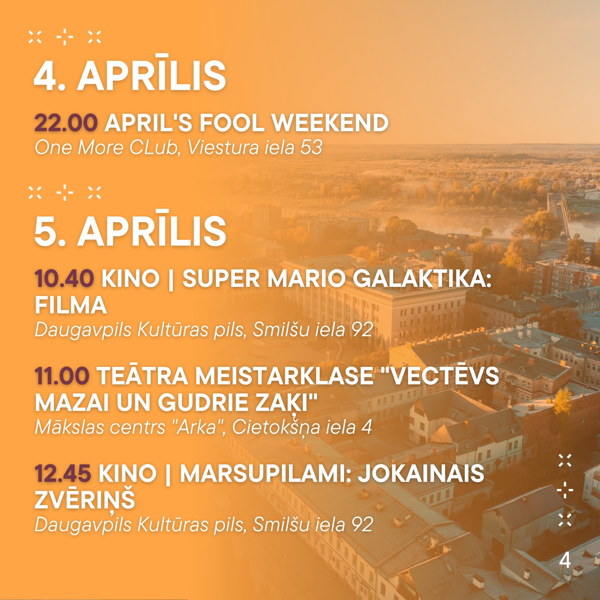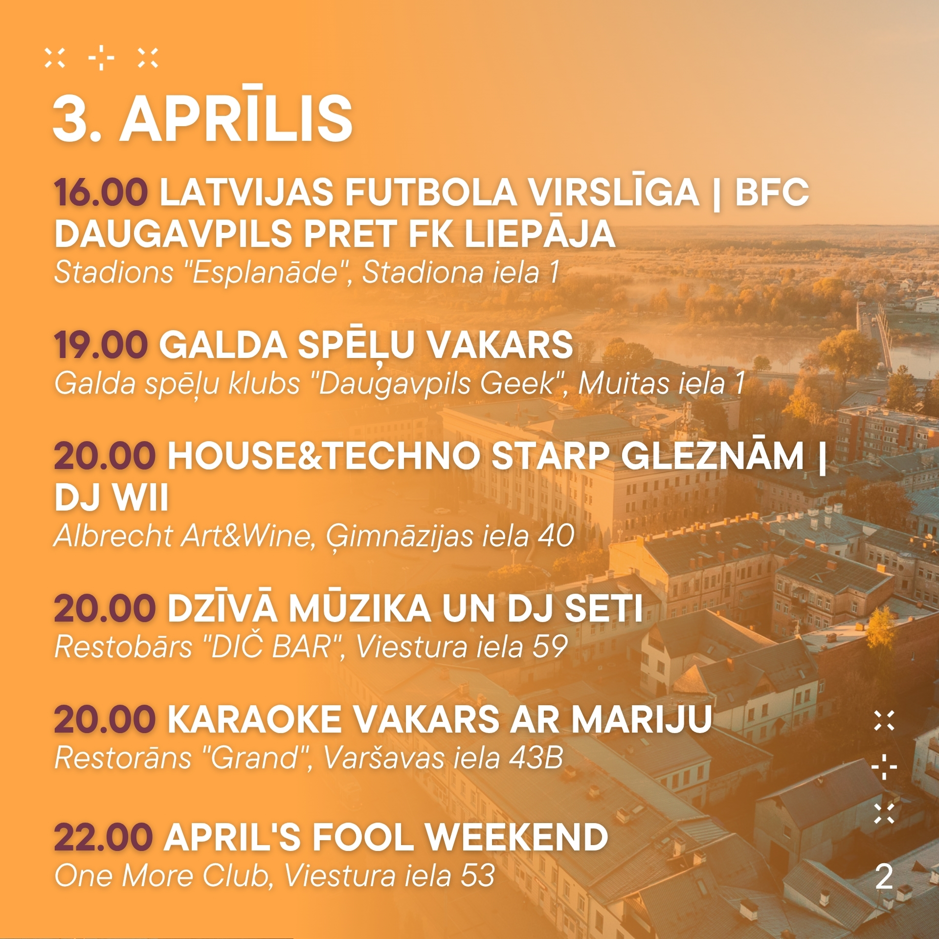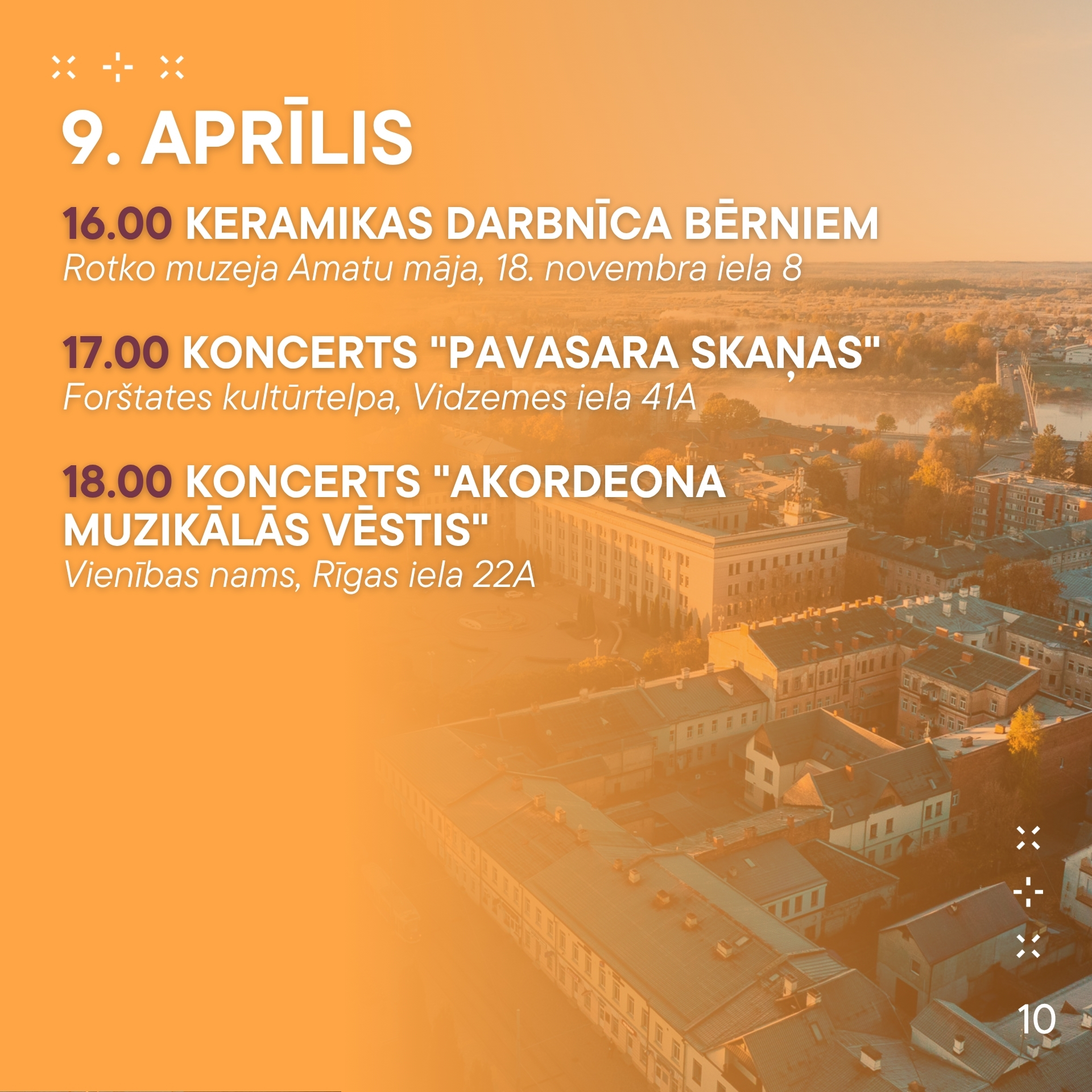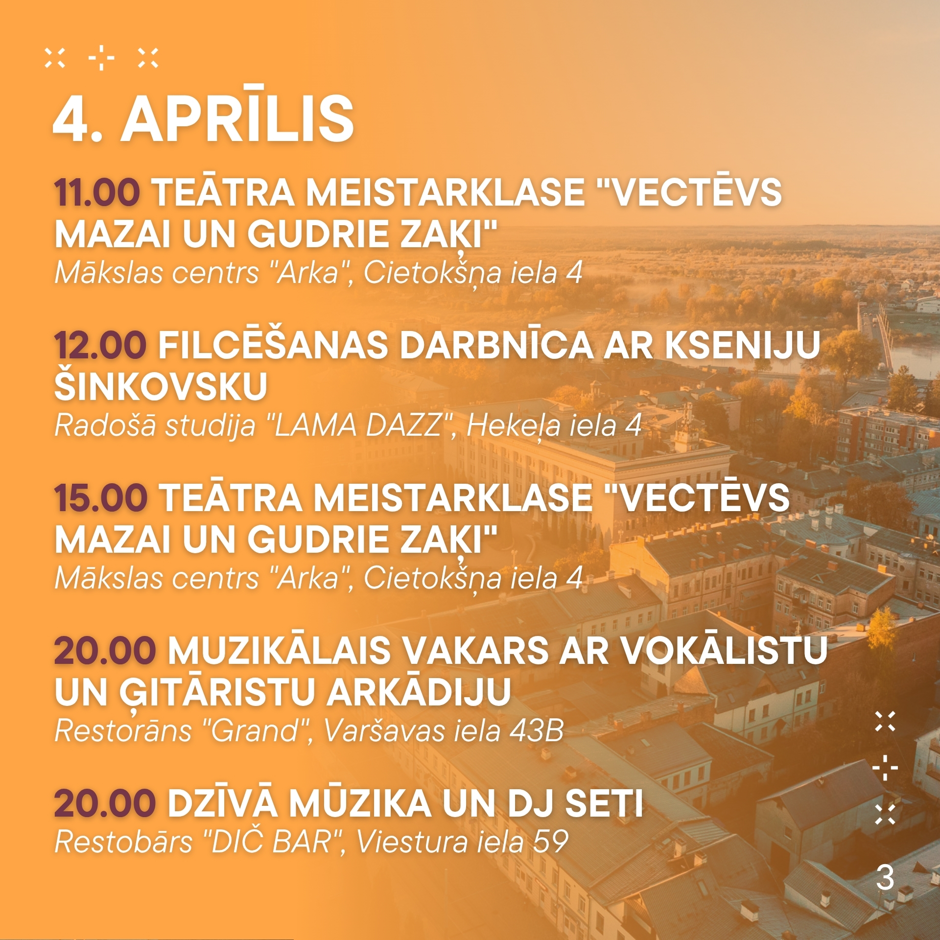 No 3. aprīļa līdz 9. aprīlim aicinām ikvienu piedalīties pasākumos, kas norisināsies mūsu pilsētā. Nepalaid garām iespēju baudīt labāko no mākslas, mūzikas un dažādām aktivitātēm! Nāc kopā ar draugiem un ģimeni, izbaudi nedēļu pilnu ar piedzīvojumiem.