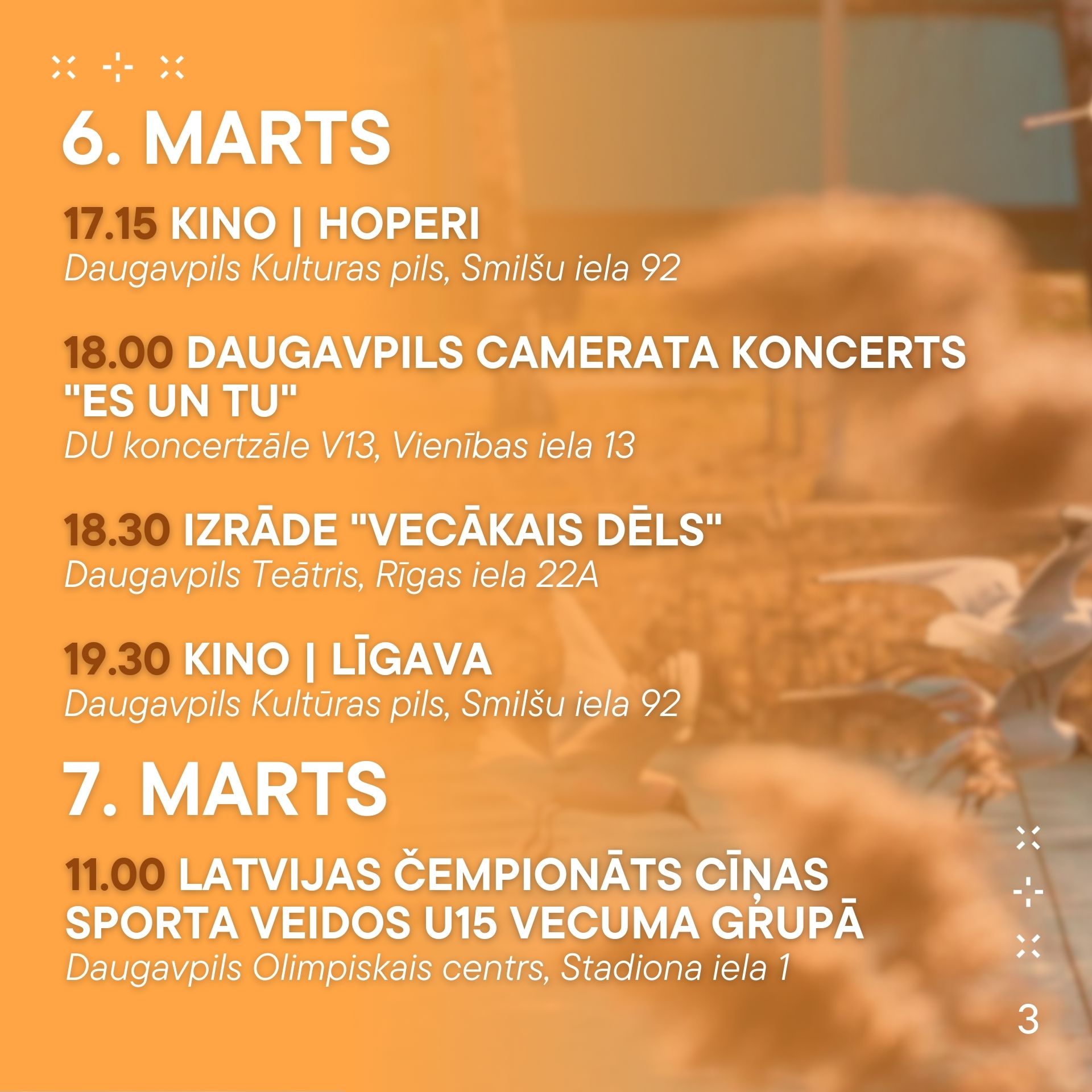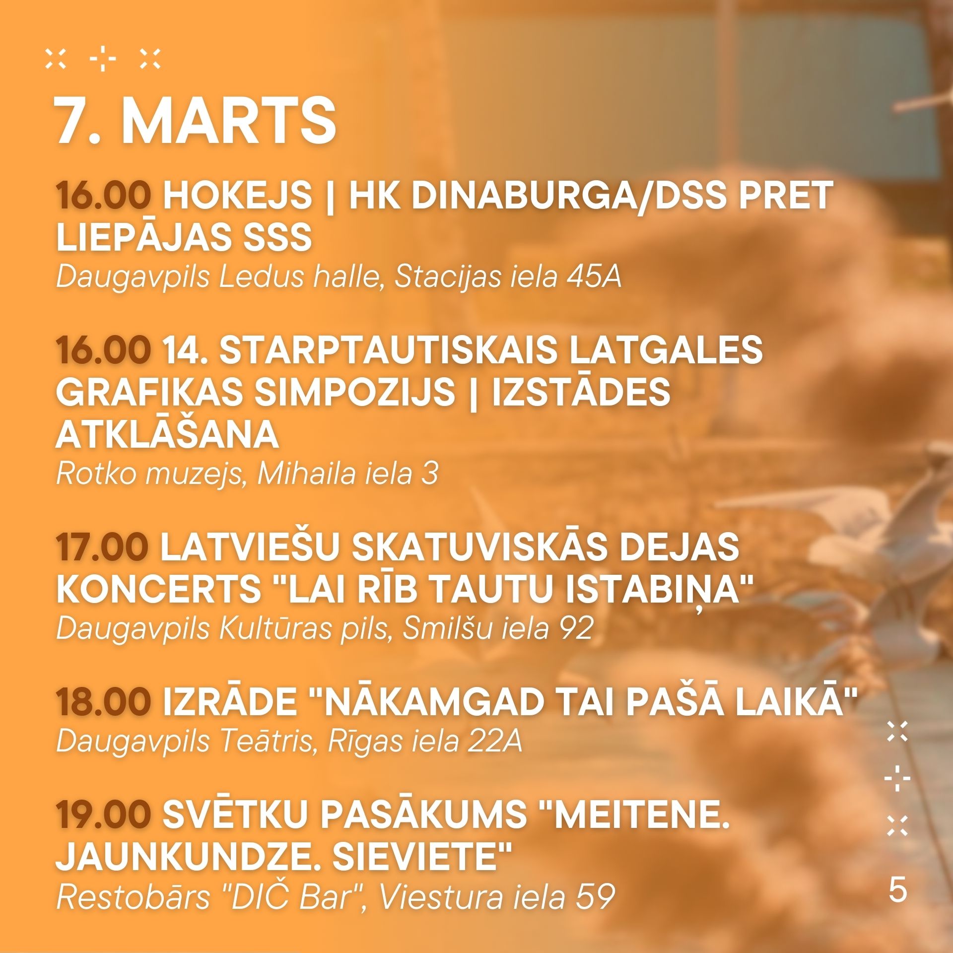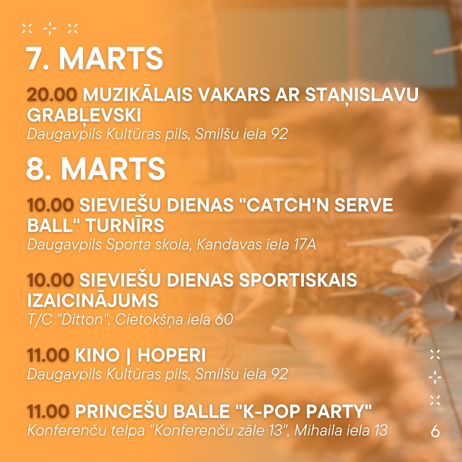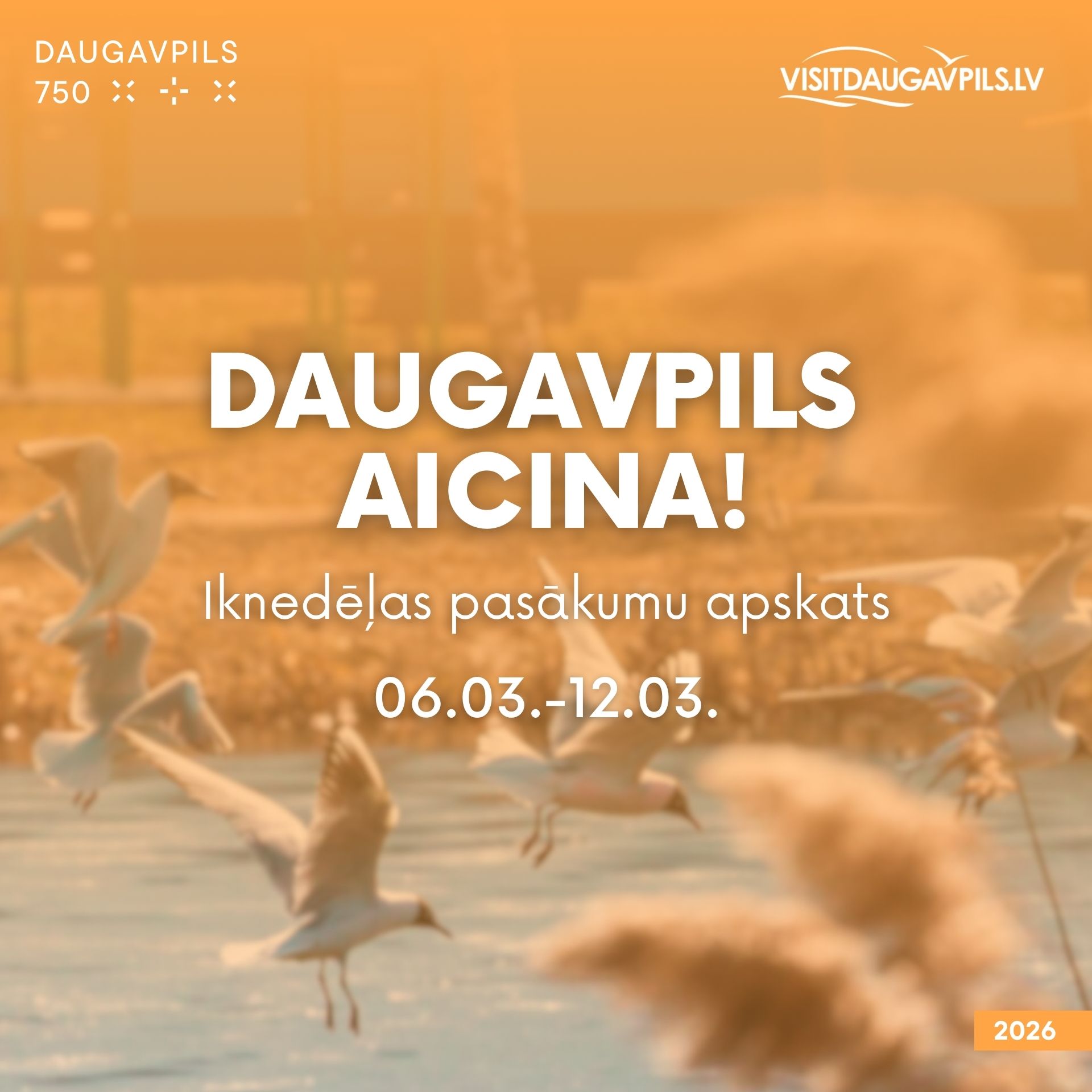 No 6. marta līdz 12. martam aicinām ikvienu piedalīties pasākumos, kas norisināsies mūsu pilsētā. Nepalaid garām iespēju baudīt labāko no mākslas, mūzikas un dažādām aktivitātēm! Nāc kopā ar draugiem un ģimeni, izbaudi nedēļu pilnu ar piedzīvojumiem.