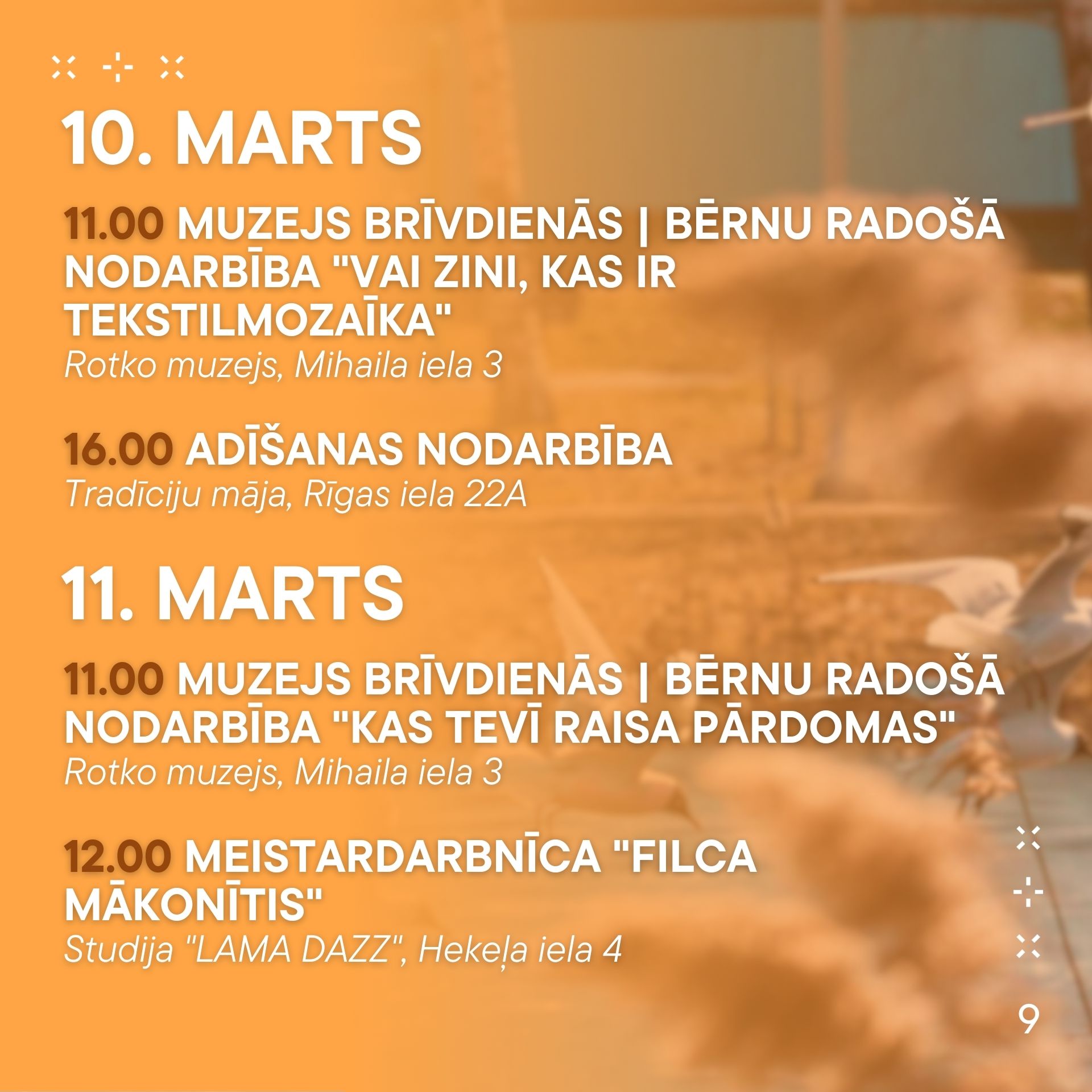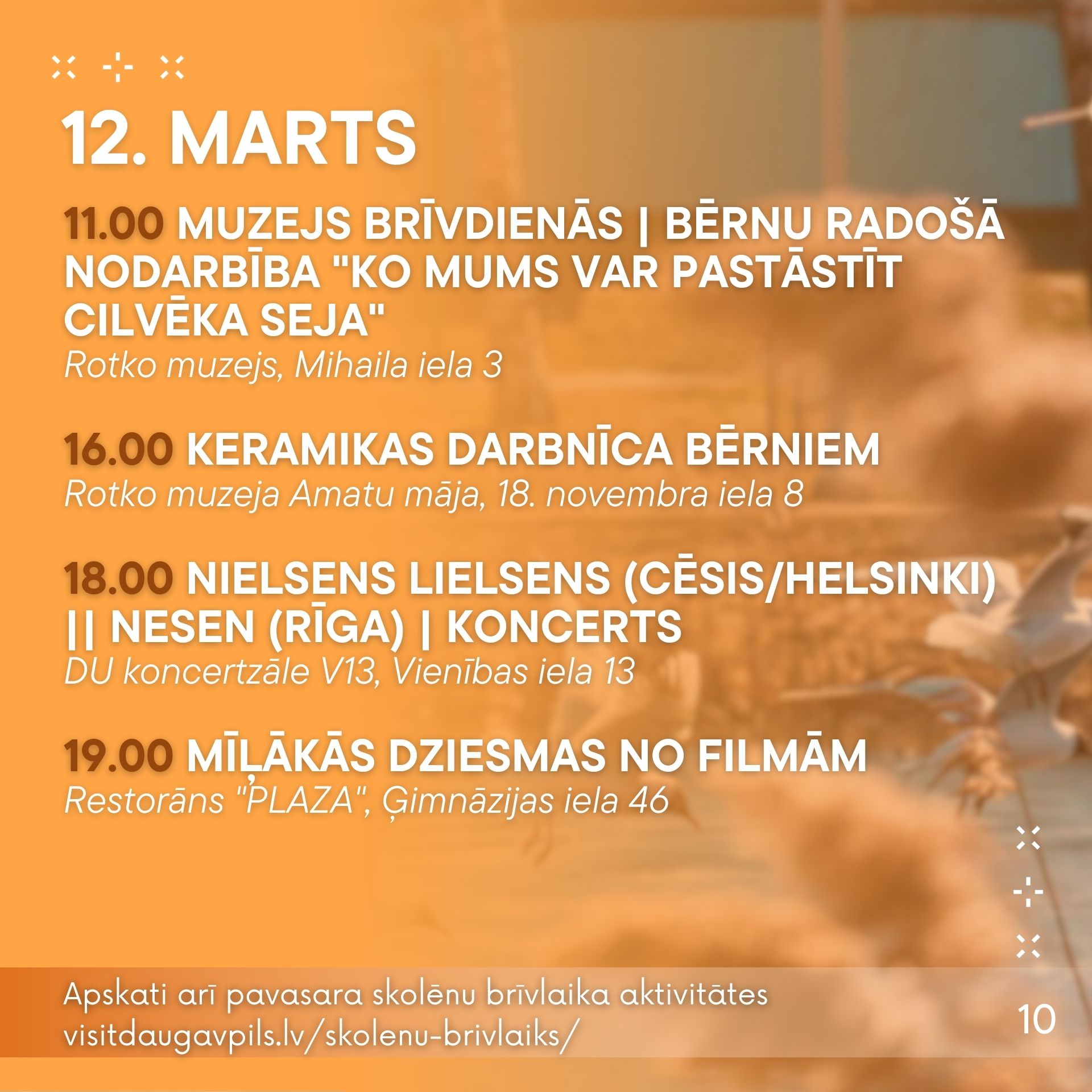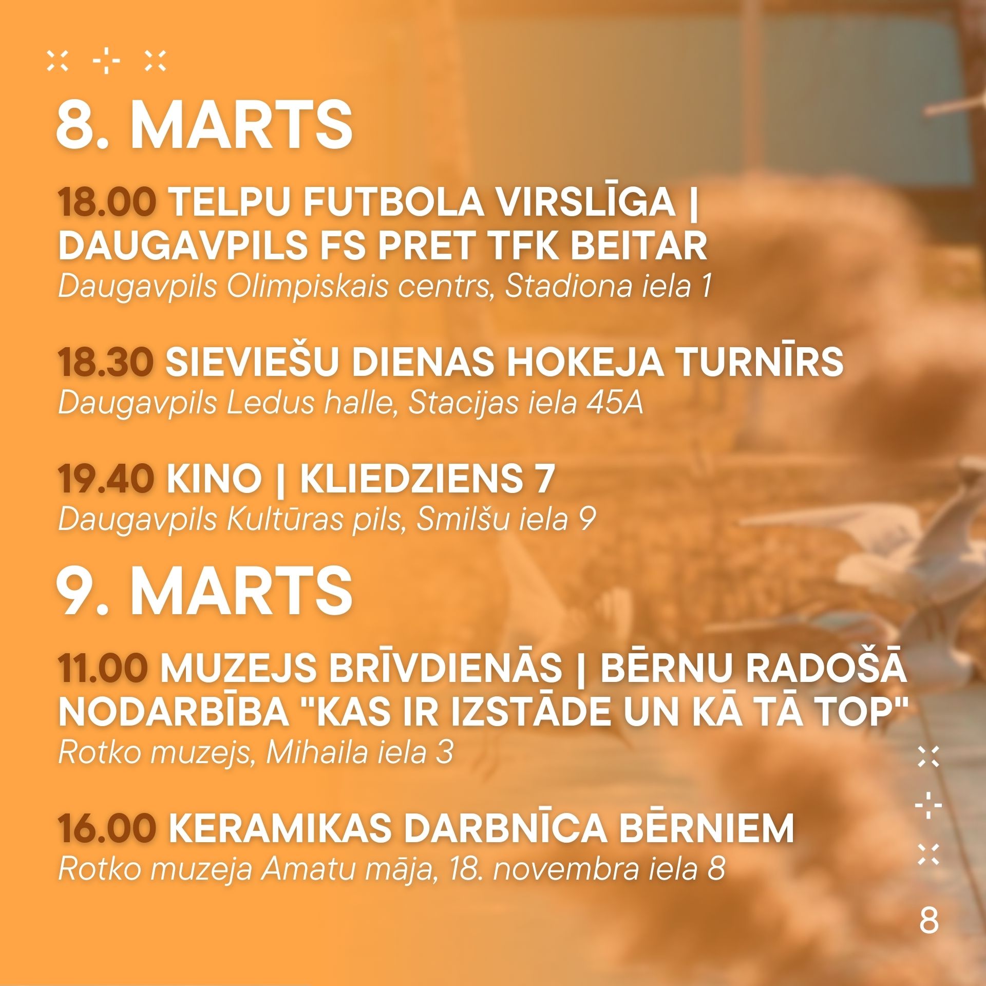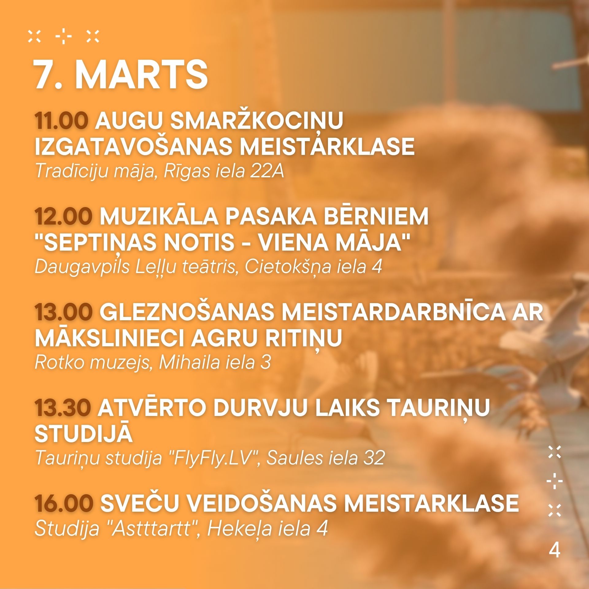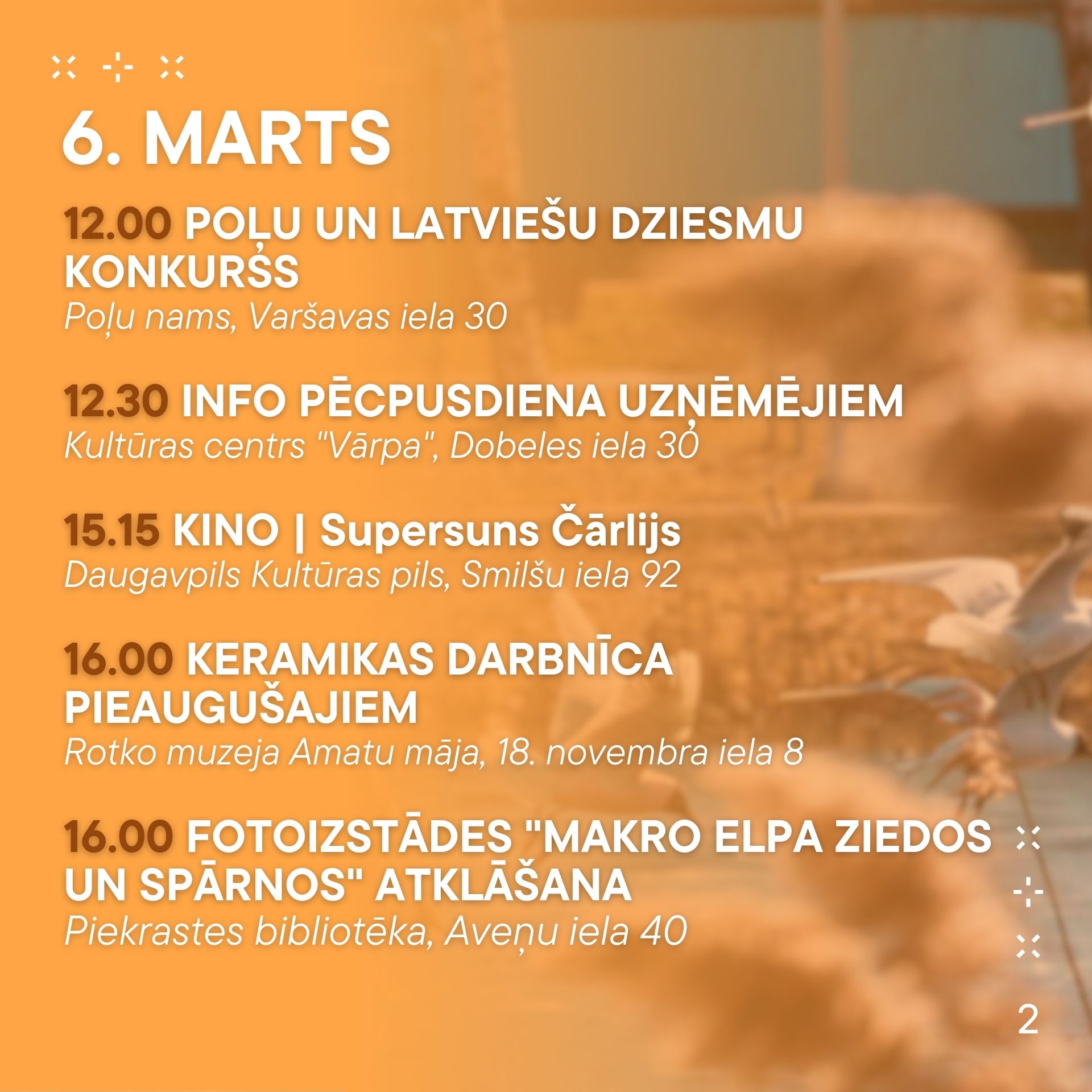 No 6. marta līdz 12. martam aicinām ikvienu piedalīties pasākumos, kas norisināsies mūsu pilsētā. Nepalaid garām iespēju baudīt labāko no mākslas, mūzikas un dažādām aktivitātēm! Nāc kopā ar draugiem un ģimeni, izbaudi nedēļu pilnu ar piedzīvojumiem.