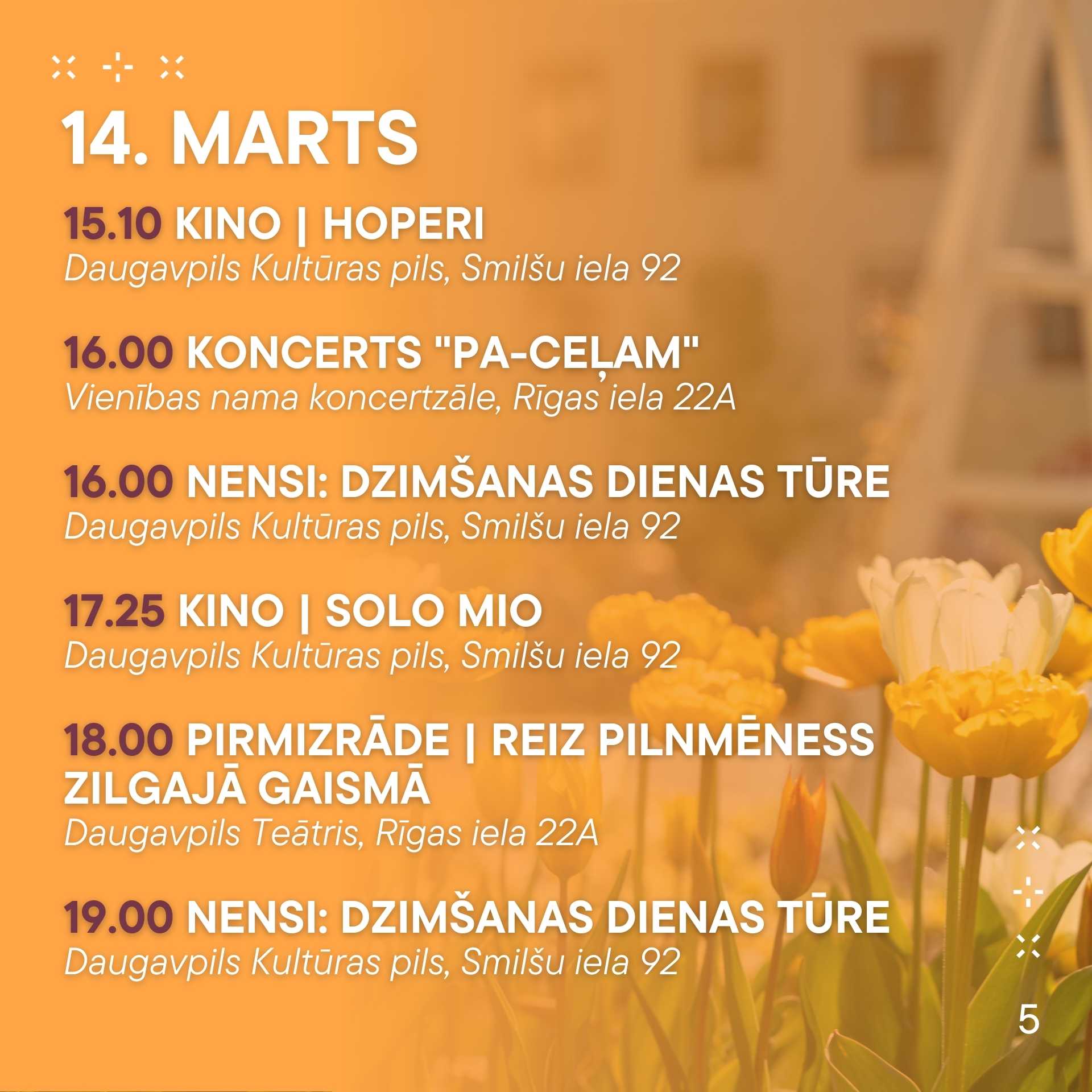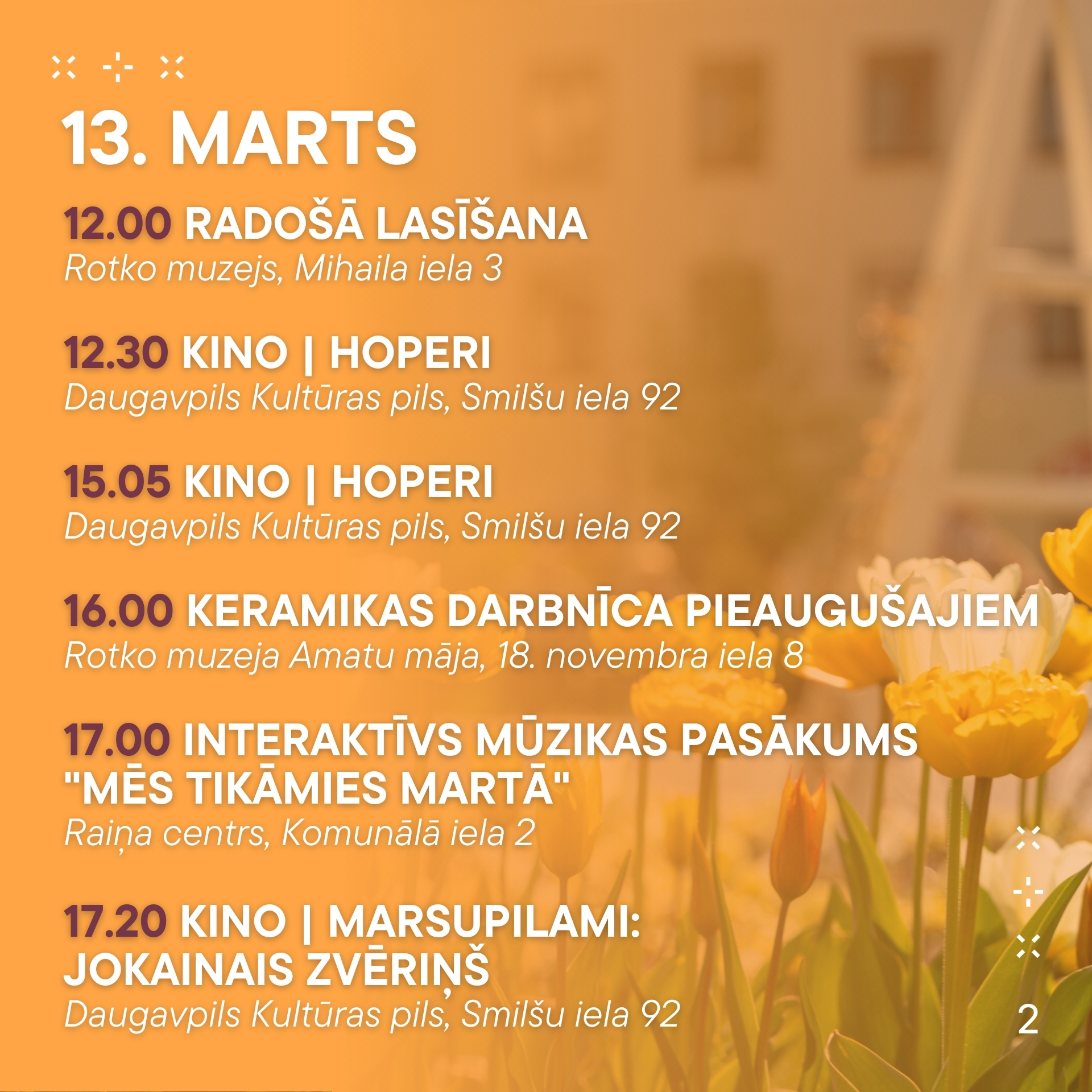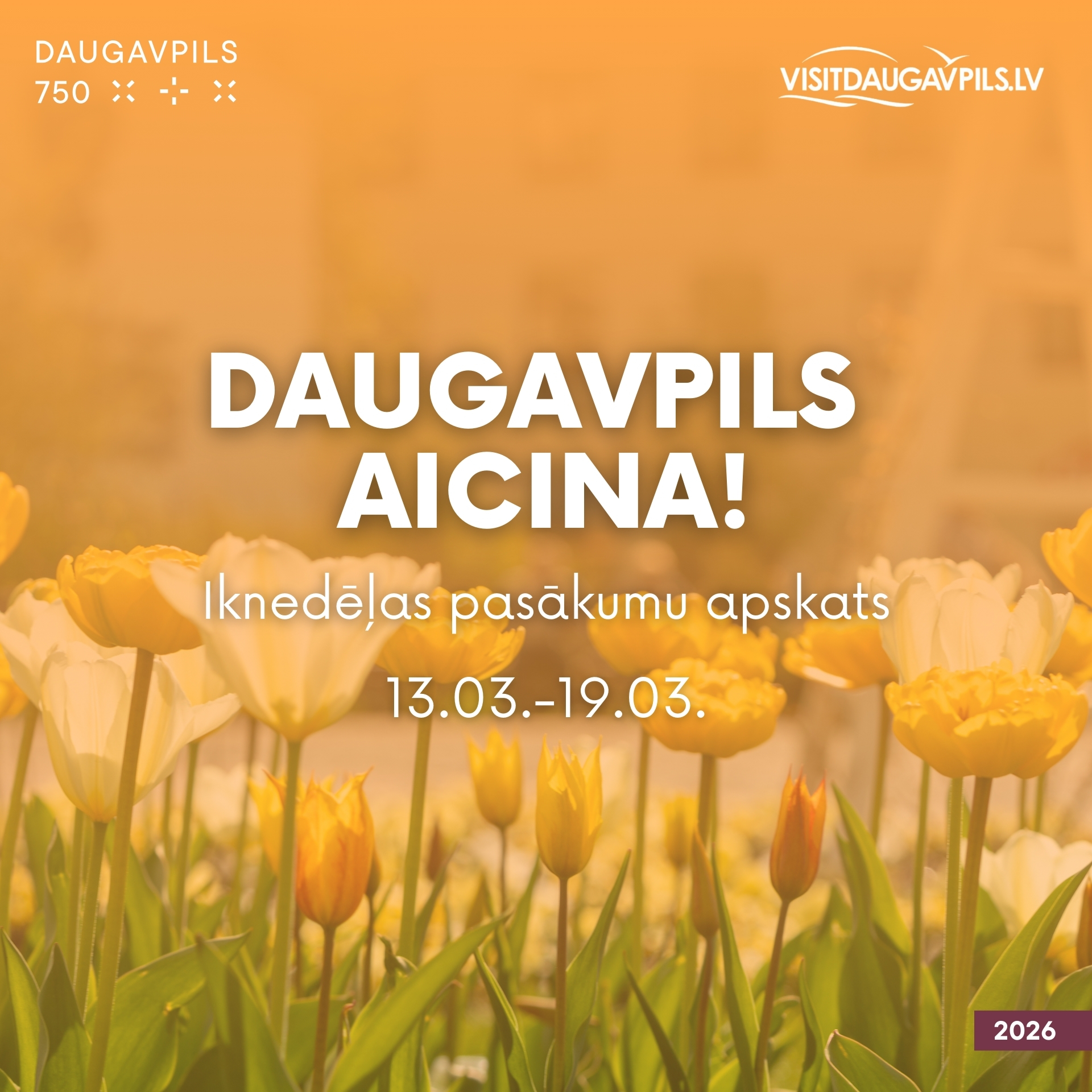 No 13. marta līdz 19. martam aicinām ikvienu piedalīties pasākumos, kas norisināsies mūsu pilsētā. Nepalaid garām iespēju baudīt labāko no mākslas, mūzikas un dažādām aktivitātēm! Nāc kopā ar draugiem un ģimeni, izbaudi nedēļu pilnu ar piedzīvojumiem.