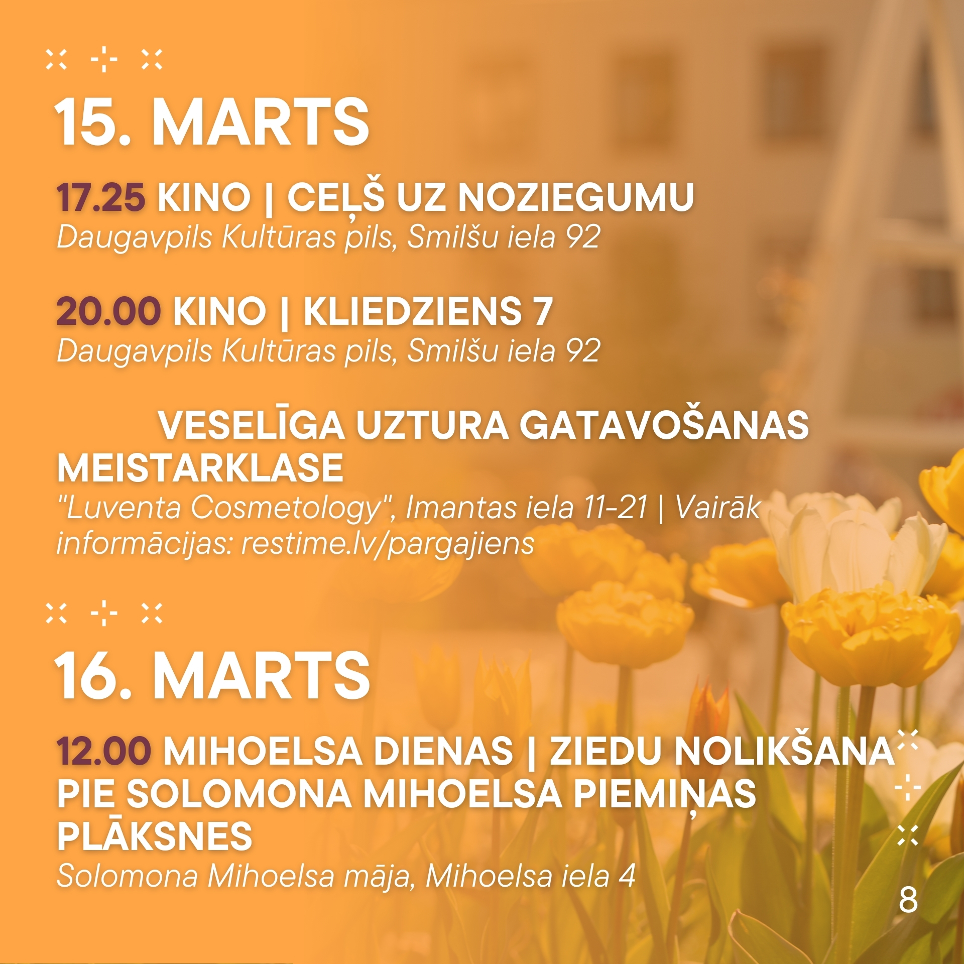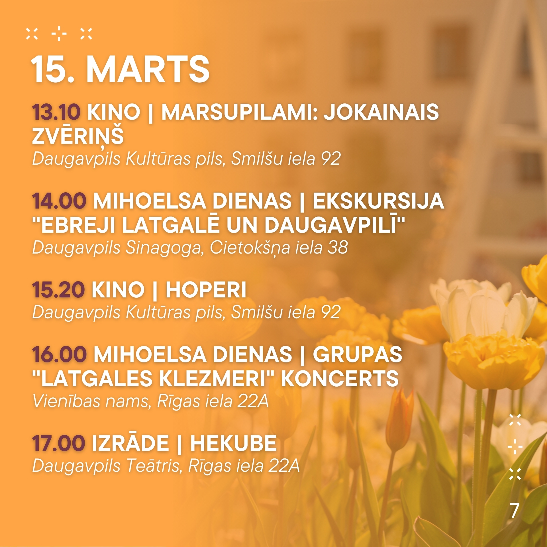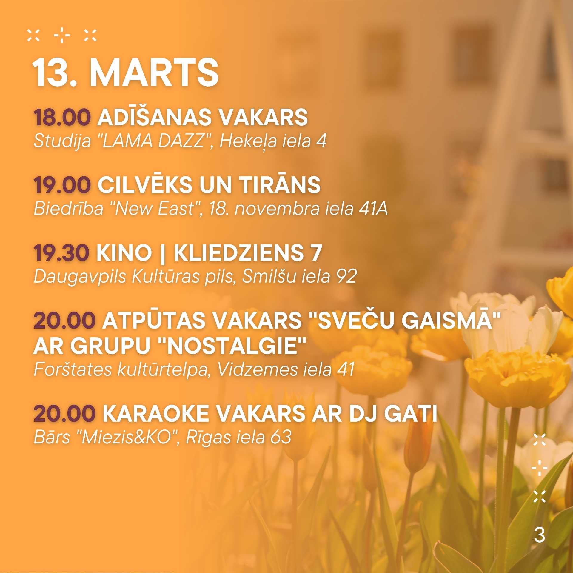 No 13. marta līdz 19. martam aicinām ikvienu piedalīties pasākumos, kas norisināsies mūsu pilsētā. Nepalaid garām iespēju baudīt labāko no mākslas, mūzikas un dažādām aktivitātēm! Nāc kopā ar draugiem un ģimeni, izbaudi nedēļu pilnu ar piedzīvojumiem.