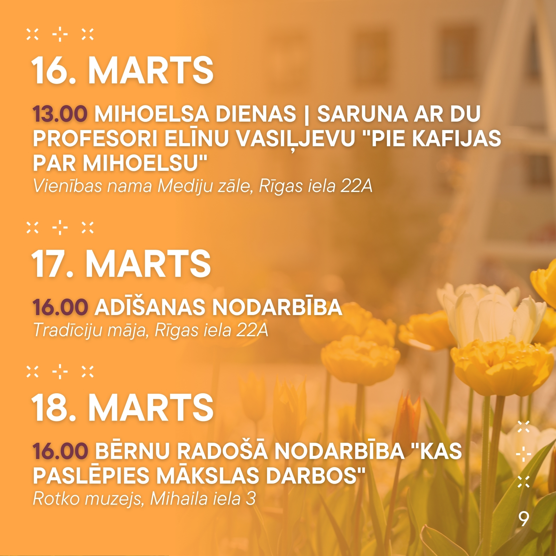 - 13.00 | Mihoelsa dienas | Saruna ar DU profesori Elīnu Vasiļjevu “Pie kafijas par Mihoelsu” | Vienības nama Mediju zāle, Rīgas iela 22A