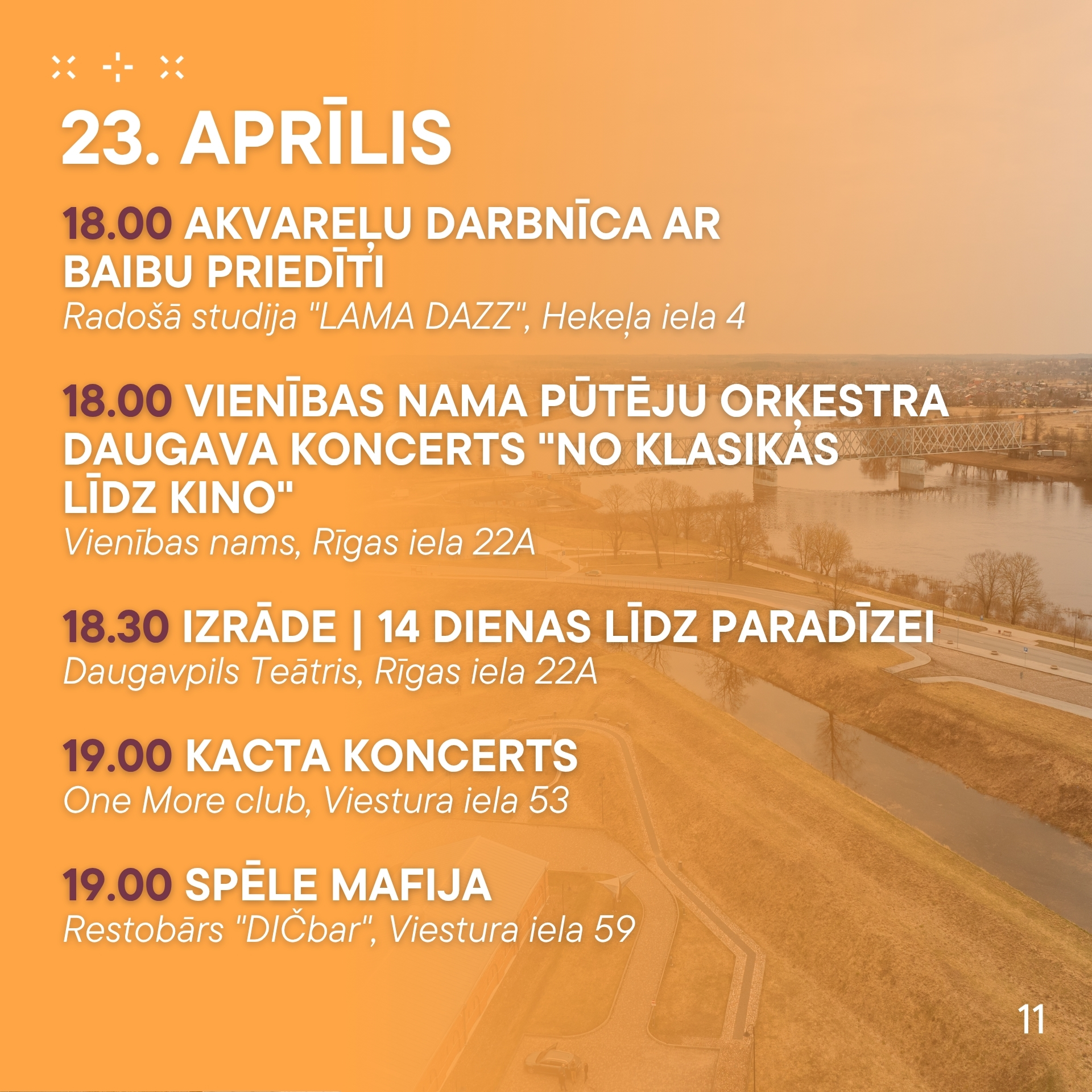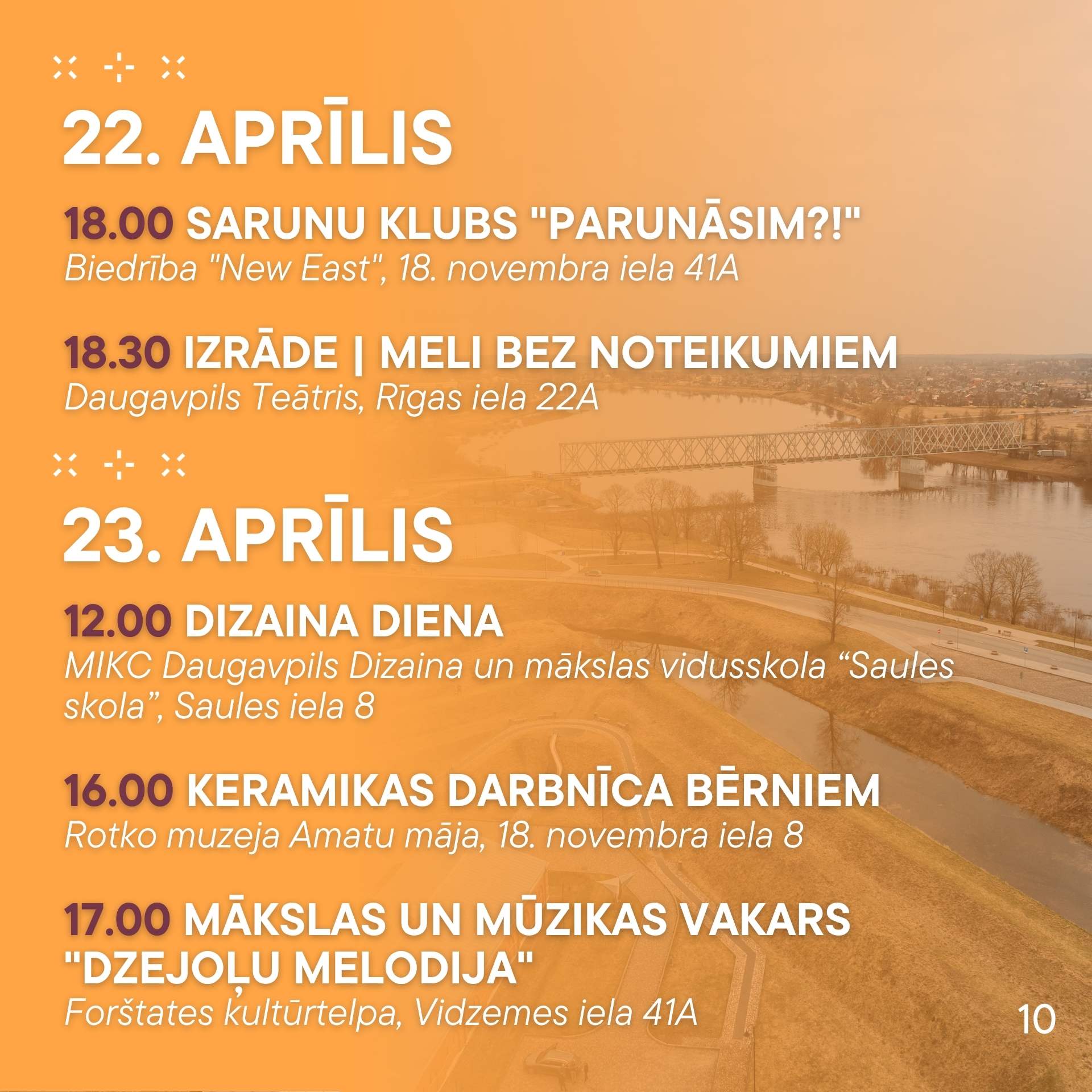 No 17. aprīļa līdz 23. aprīlim aicinām ikvienu piedalīties pasākumos, kas norisināsies mūsu pilsētā. Nepalaid garām iespēju baudīt labāko no mākslas, mūzikas un dažādām aktivitātēm! Nāc kopā ar draugiem un ģimeni, izbaudi nedēļu pilnu ar piedzīvojumiem.