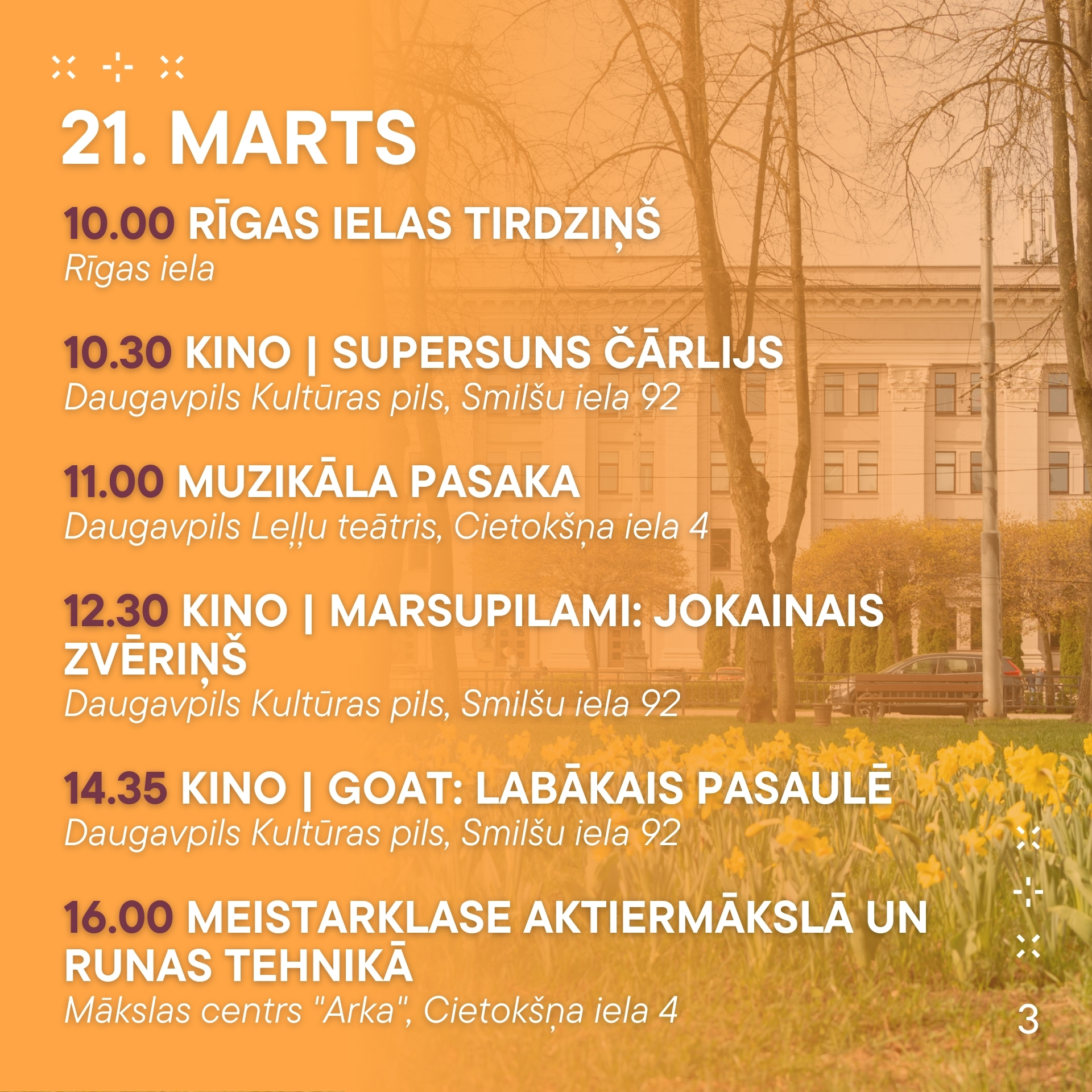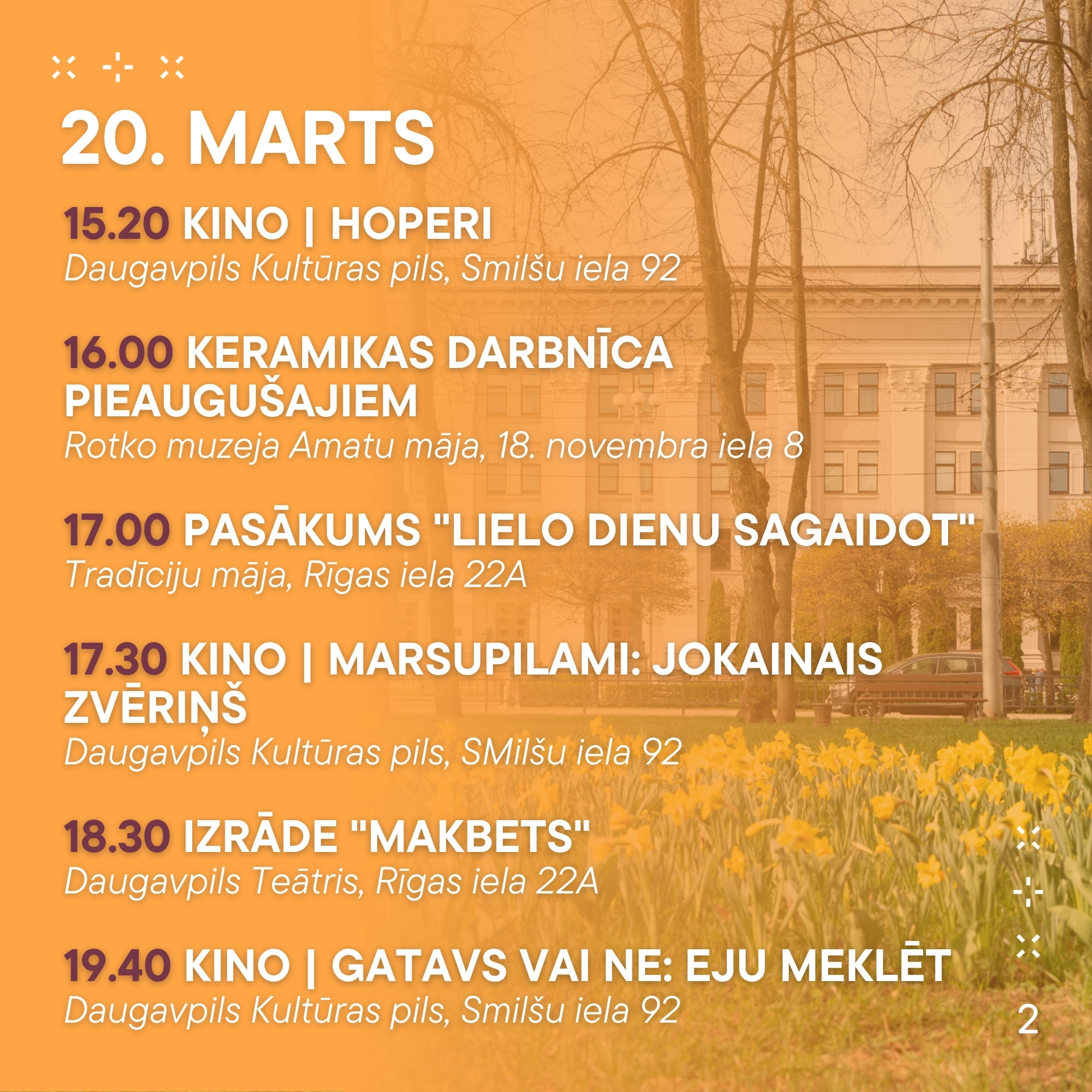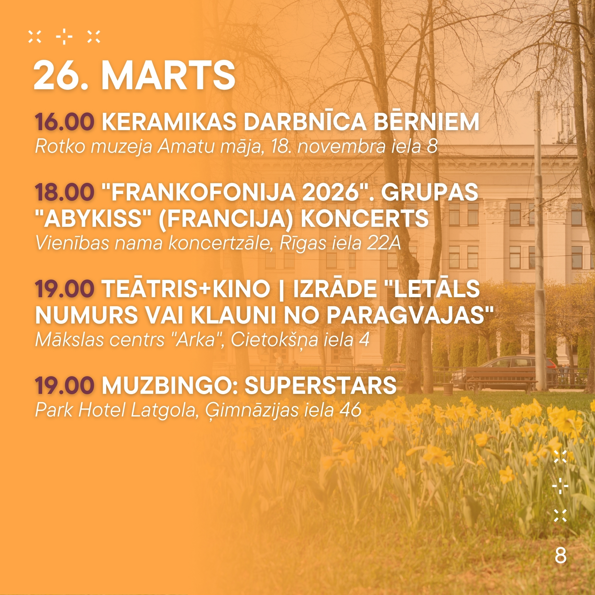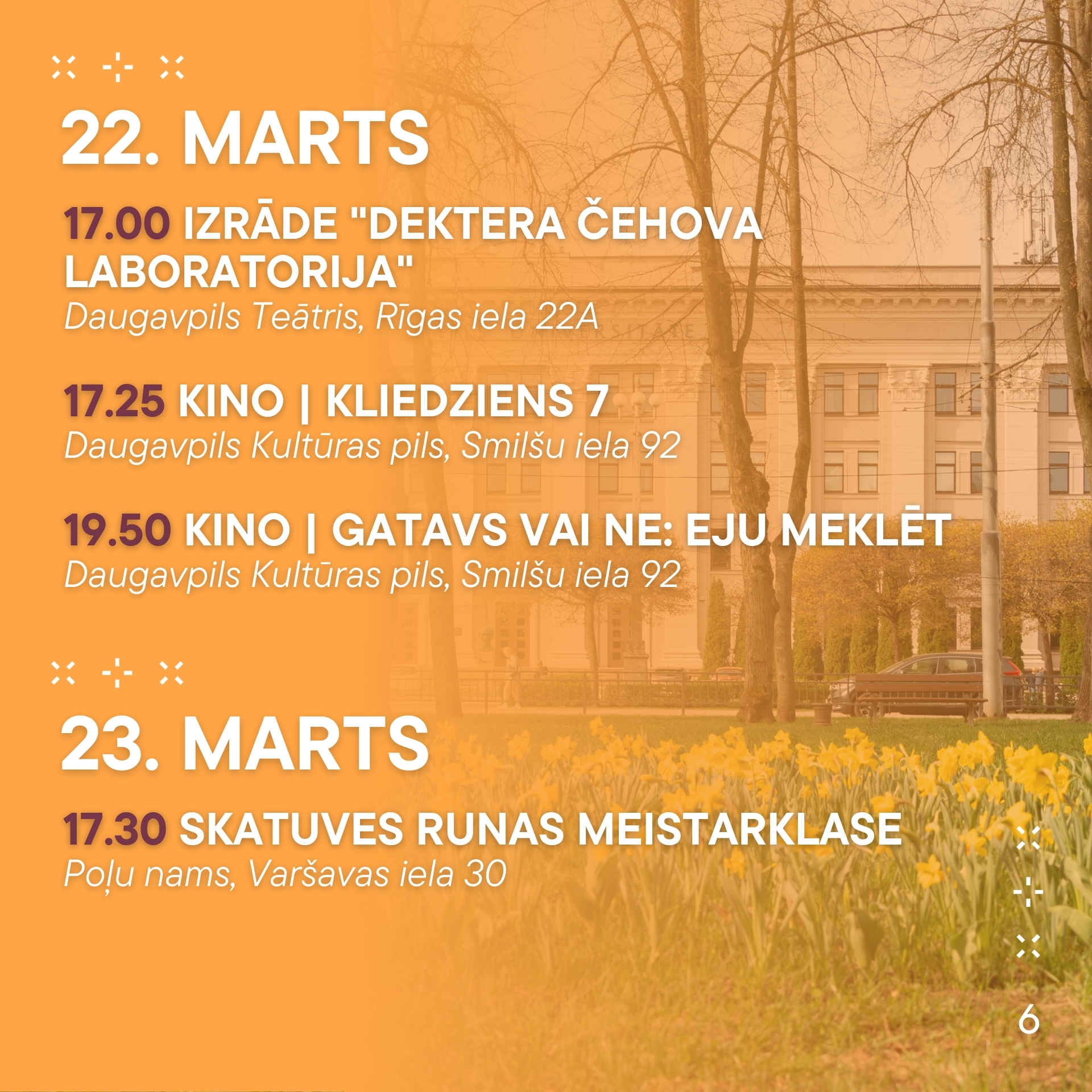 No 20. marta līdz 26. martam aicinām ikvienu piedalīties pasākumos, kas norisināsies mūsu pilsētā. Nepalaid garām iespēju baudīt labāko no mākslas, mūzikas un dažādām aktivitātēm! Nāc kopā ar draugiem un ģimeni, izbaudi nedēļu pilnu ar piedzīvojumiem.