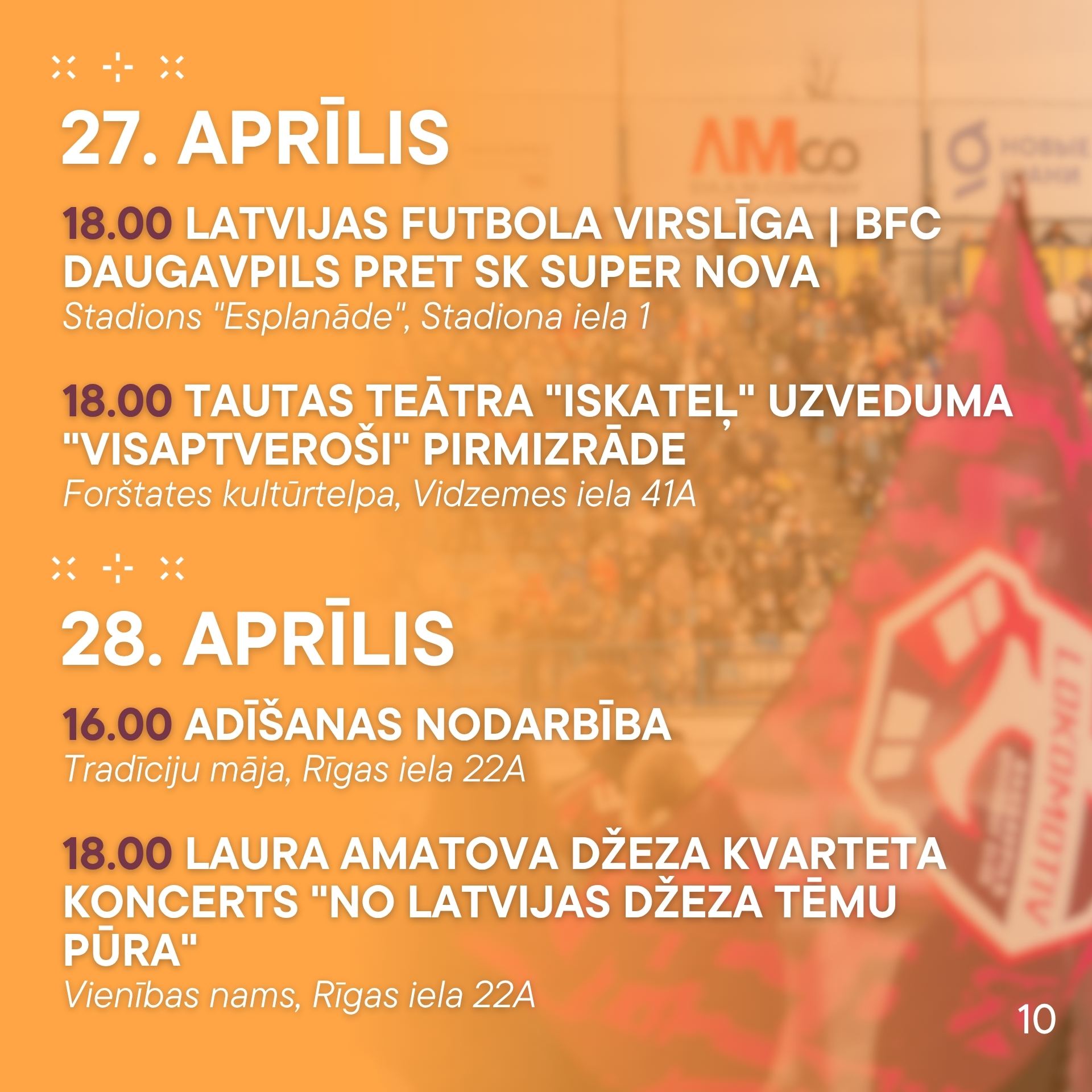 - 18.00 | Latvijas futbola Virslīga | BFC Daugavpils pret SK Super Nova | Stadions “Esplanāde”, Stadiona iela 1