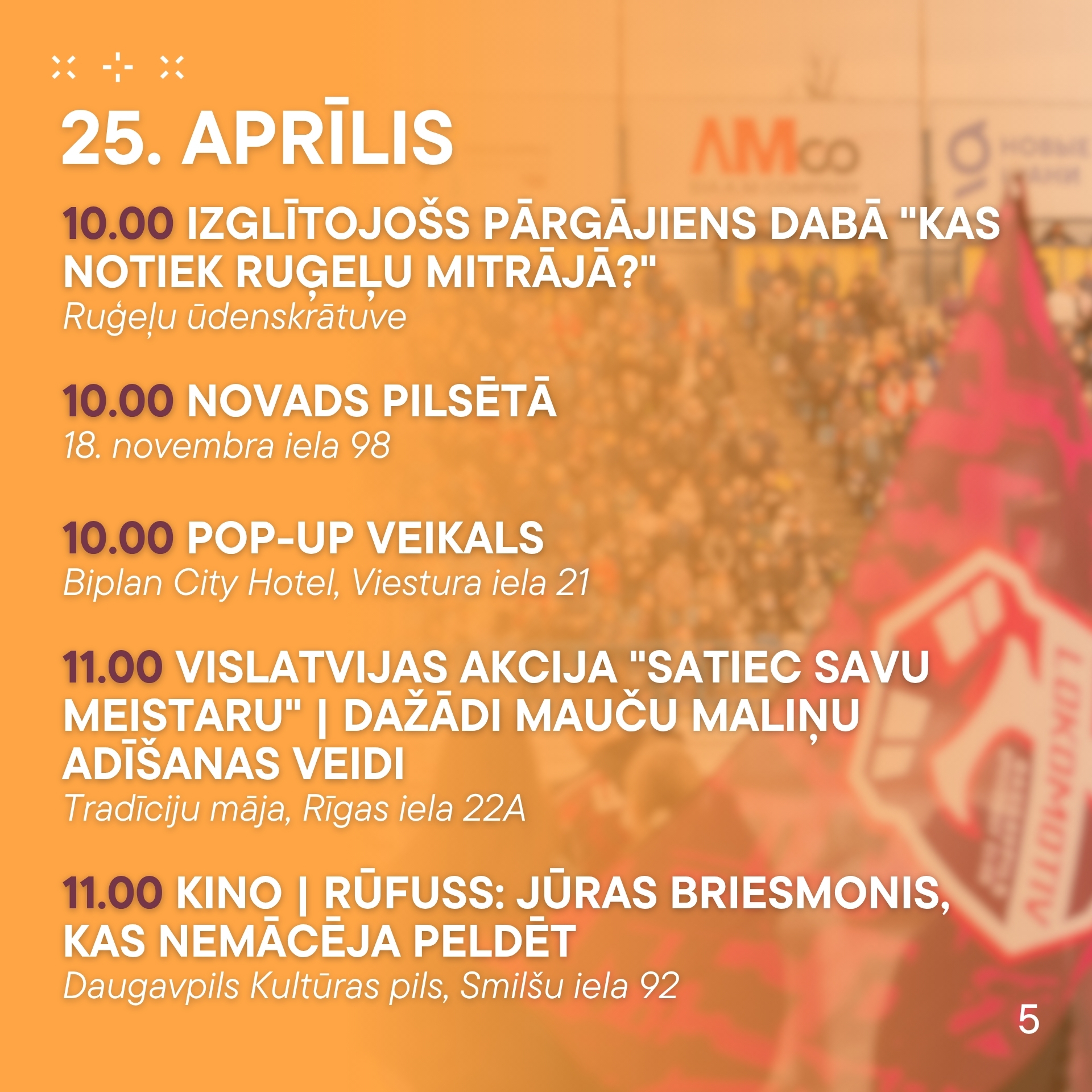 No 24. aprīļa līdz 30. aprīlim aicinām ikvienu piedalīties pasākumos, kas norisināsies mūsu pilsētā. Nepalaid garām iespēju baudīt labāko no mākslas, mūzikas un dažādām aktivitātēm! Nāc kopā ar draugiem un ģimeni, izbaudi nedēļu pilnu ar piedzīvojumiem.