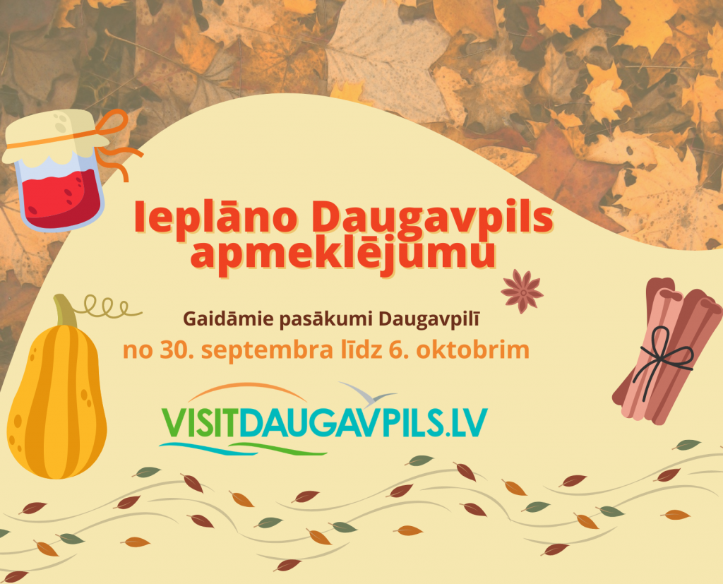 Pasākumi Daugavpilī no 30. septembra līdz 6. oktobrim 30.09.2022 Ieplāno Daugavpils apmeklējumu! Pasākumi Daugavpilī no 30. septembra līdz 6. oktobrim Plānojot atpūtu no 30. septembra līdz 6. oktobrim Daugavpilī, aicinām iepazīties ar kultūras un sporta pasākumu, kā arī izstāžu piedāvājumu.