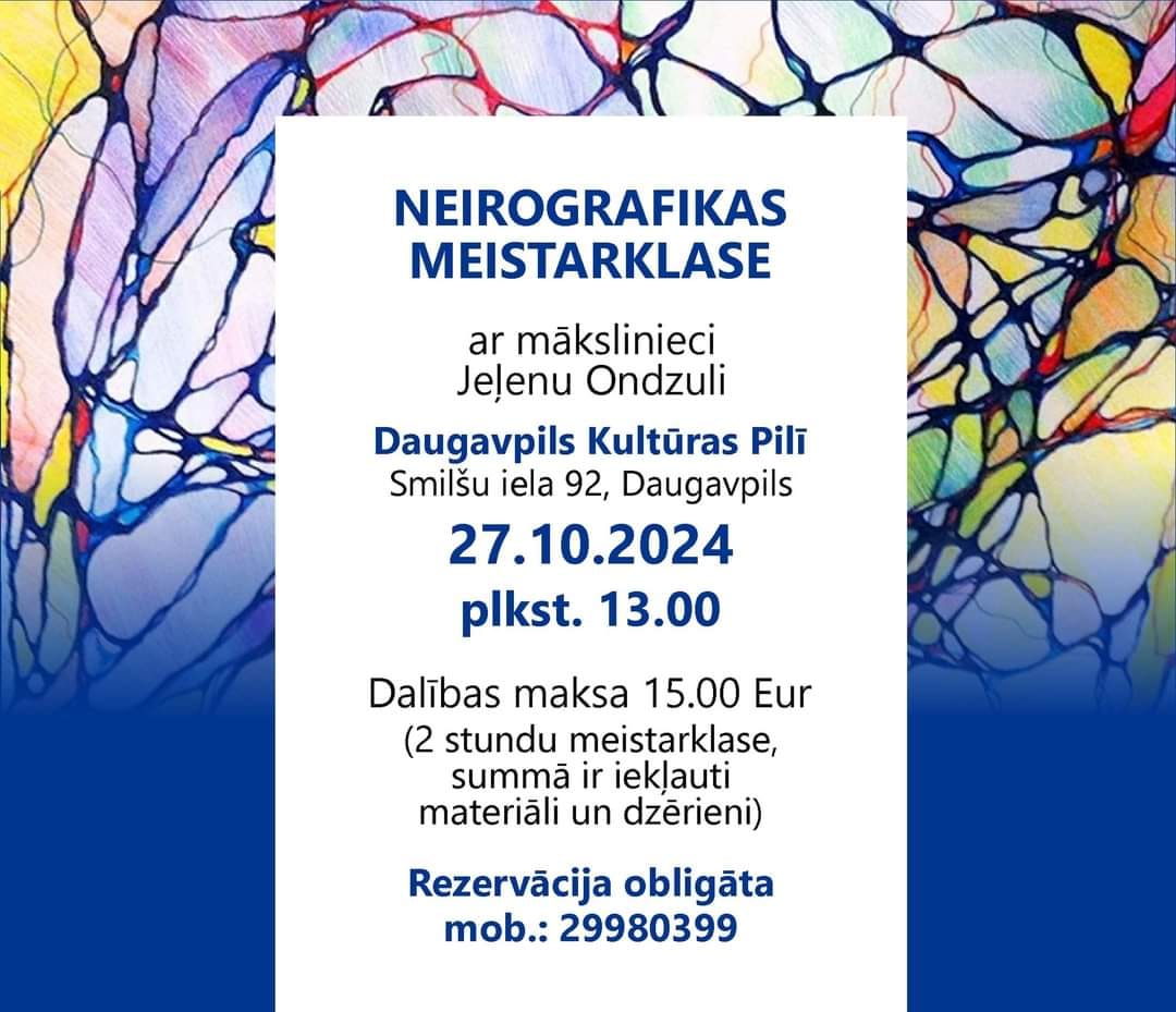 27. oktobrī plkst. 13.00 Daugavpils Kultūras pilī notiks neirogrāfikas meistarklase ar mākslinieci Jeļenu Ondzuli.