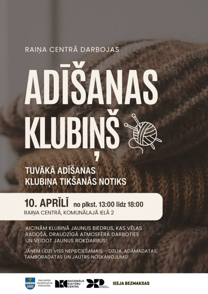10. aprīlī plkst. 12.00 Raiņa centrā notiks pasākums “Adīšanas klubiņš”. Ieeja pasākumā ir bez maksas, dalībnieki tiek aicināti paņemt līdzi dziju, adāmadatas un citus nepieciešamos materiālus.
