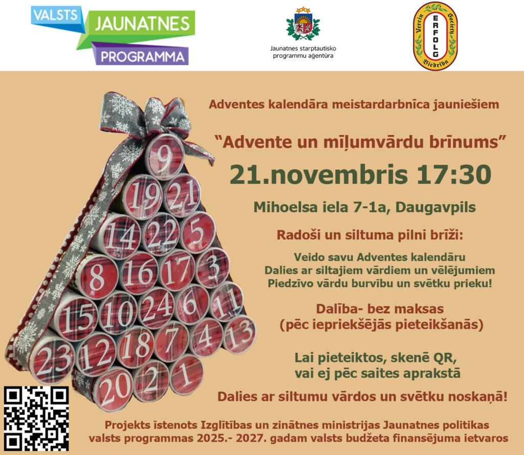 21. novembrī plkst. 17.30 notiks Adventes kalendāra meistardarbnīca jauniešiem (no 13 līdz 25 gadiem), kuras laikā vari izveidot savu Adventes kalendāru.