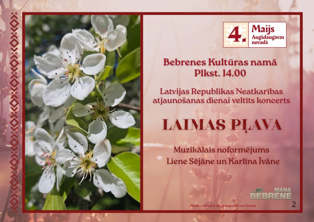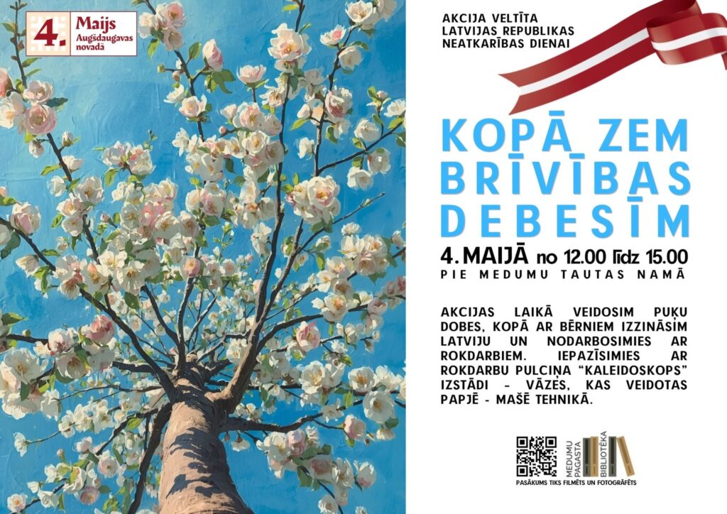 Akcija “Kopā zem brīvības debesīm” Datums: 04.05.2026Laiks: 12:00 - 15:00Norises vieta: Pie Medumu Tautas nama 4. maijā no plkst. 12.00 līdz 15.00 pie Medumu Tautas nama notiks akcija “Kopā zem brīvības debesīm”, kas ir veltīta Latvijas Republikas Neatkarības dienai.