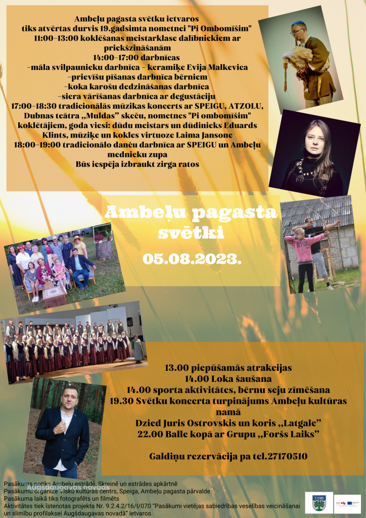 Ambeļu pagasta svētki Datums: 05.08.2023Laiks: Norises vieta: Ambeļi Šā gada 5. augustā Ambeļos notiks pagasta svētki. Bērnu atrakcijas, meistarklases, koncerts, kur uzstāsies Juris Ostrovskis un grupa “Latgale” kā arī balle kopā grupu “Foršs laiks”