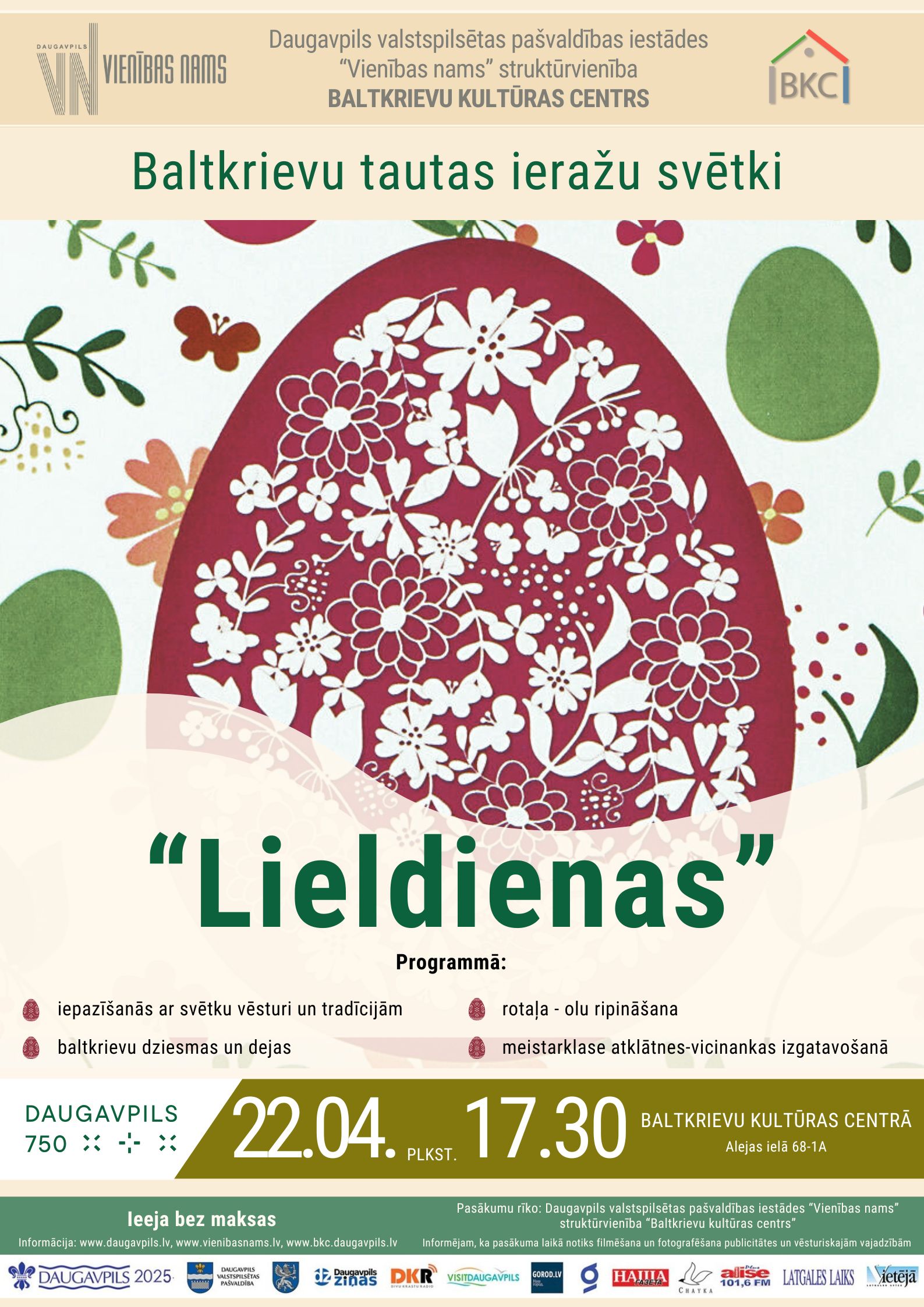 Apmeklētājiem būs iespēja iepazīties ar baltkrievu Lieldienu svētku vēsturi un tradīcijām, noklausīties baltkrievu tautasdziesmas, piedalīties rotaļā – olu ripināšana un Lieldienu atklātnes-vicinankas izgatavošanas meistarklasē. Pasākumā piedalīsies Vienības nama Baltkrievu kultūras centra amatierteātra studija “Pauļinka”, bērnu studija “Skārbnīca” un kora kapella “Spadčina”. Ieeja bez maksas.