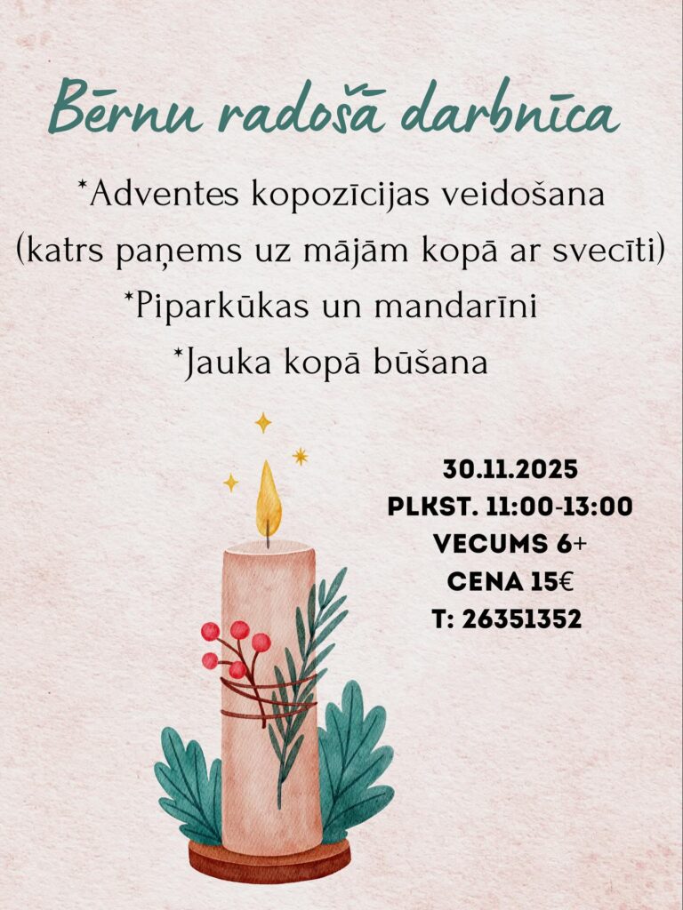 30. novembrī bērnu atpūtas un svētku istabā “SoHappy” norisināsies bērnu radošā darbnīca (no 6 gadu vecuma). Pasākuma laikā bērni veidos Adventes kompozīciju, kuru katrs paņems līdzi kopā ar sveci. Bērnus sagaida cienasts – mandarīni un piparkūkas.